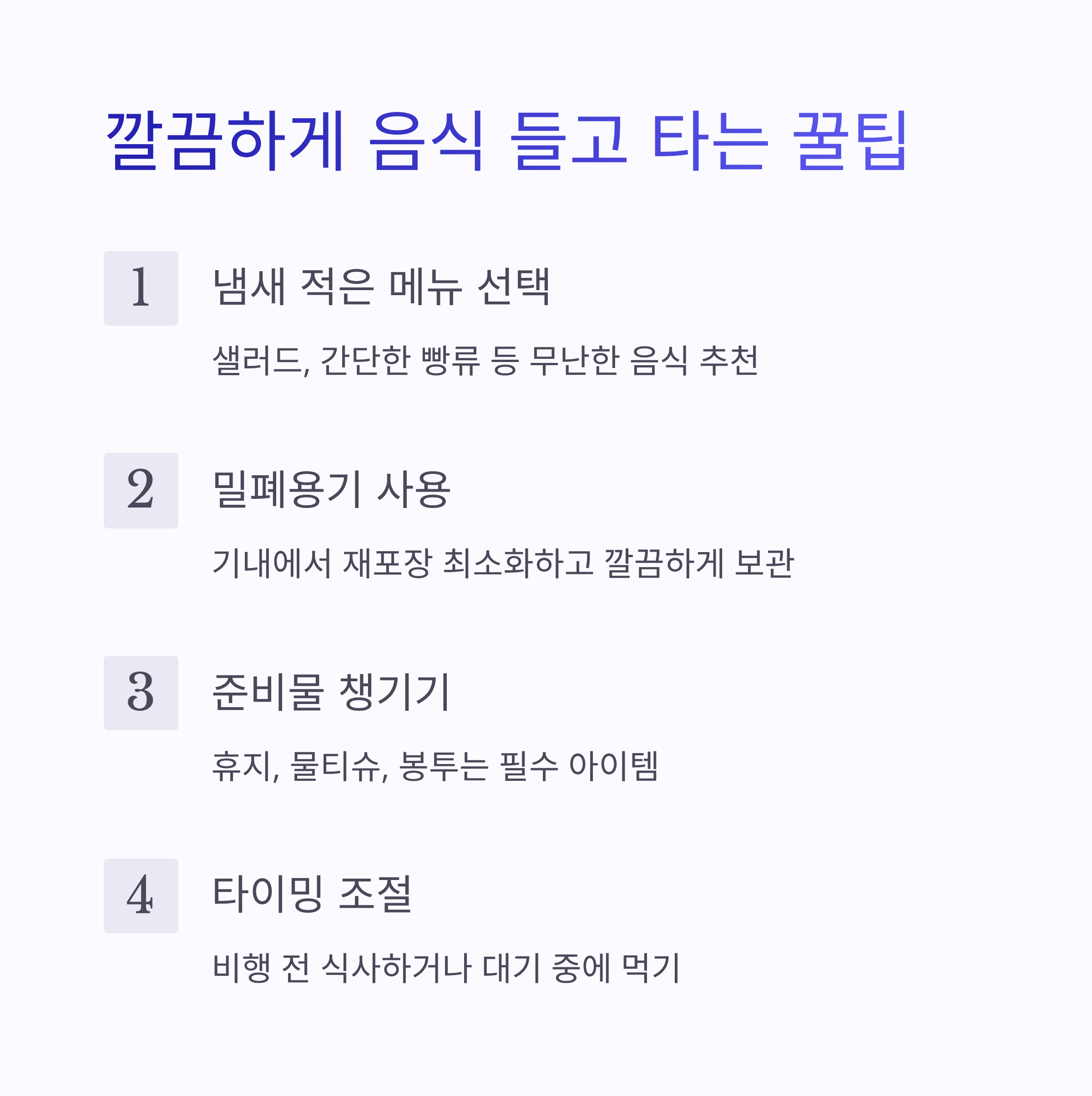 - 냄새 줄이려면 밀폐용기에 보관 + 기내 취식 금지