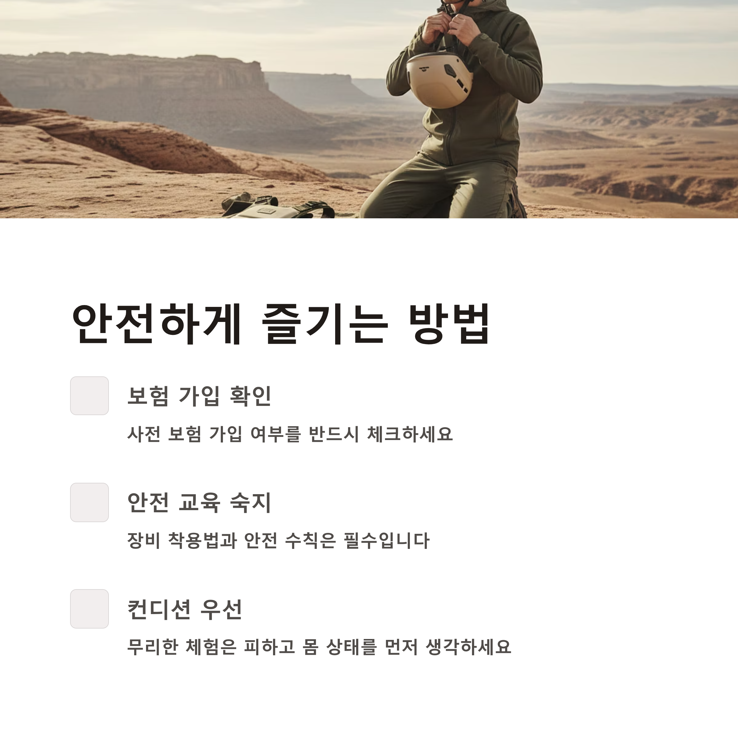 안전은 아무리 강조해도 부족하지 않죠. 특히 액티비티는 체험 자체가 신체활동이라 더 조심해야 해요!