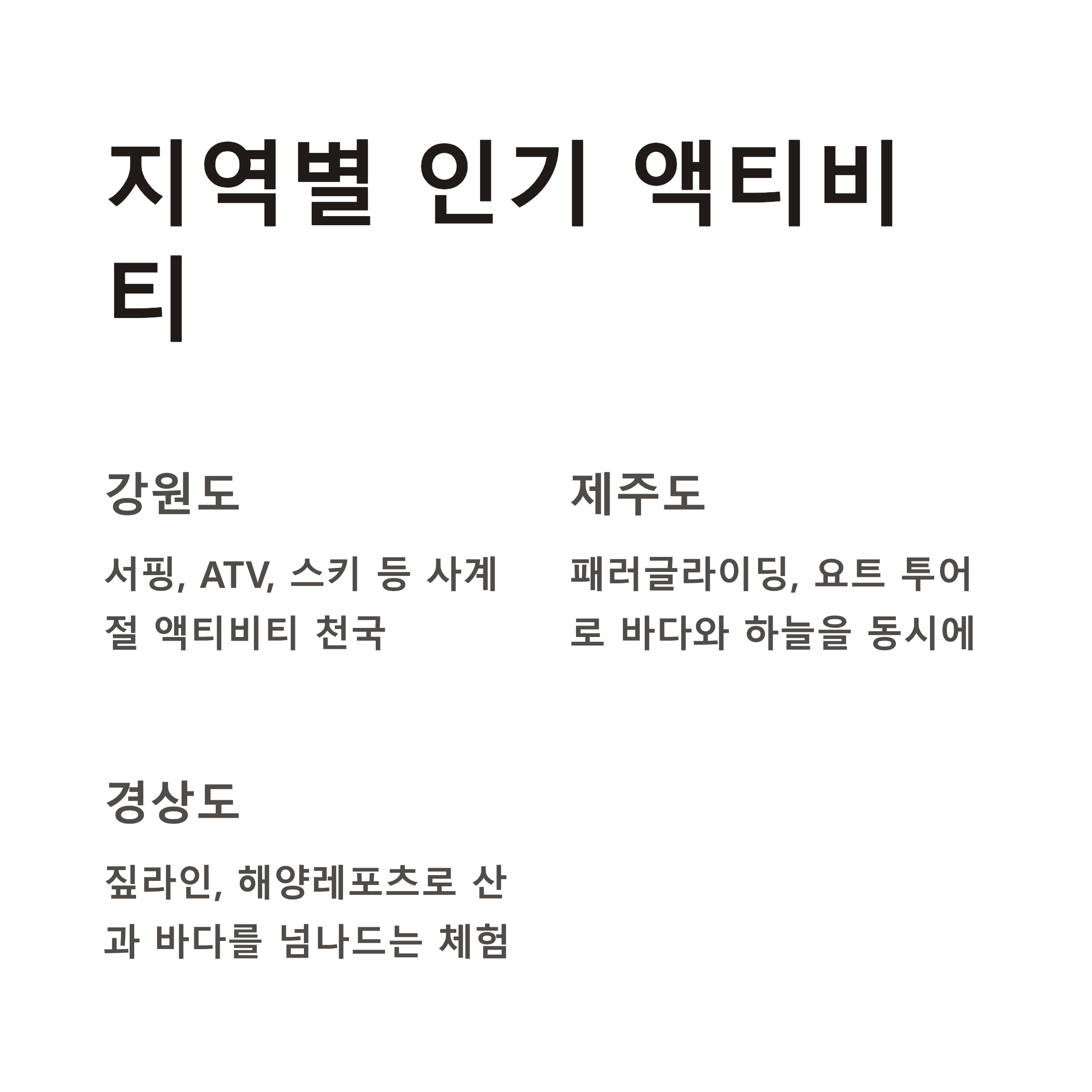 | 강원도 | 서핑, ATV, 스키 | 사계절 즐길 수 있는 액티비티 천국 |
