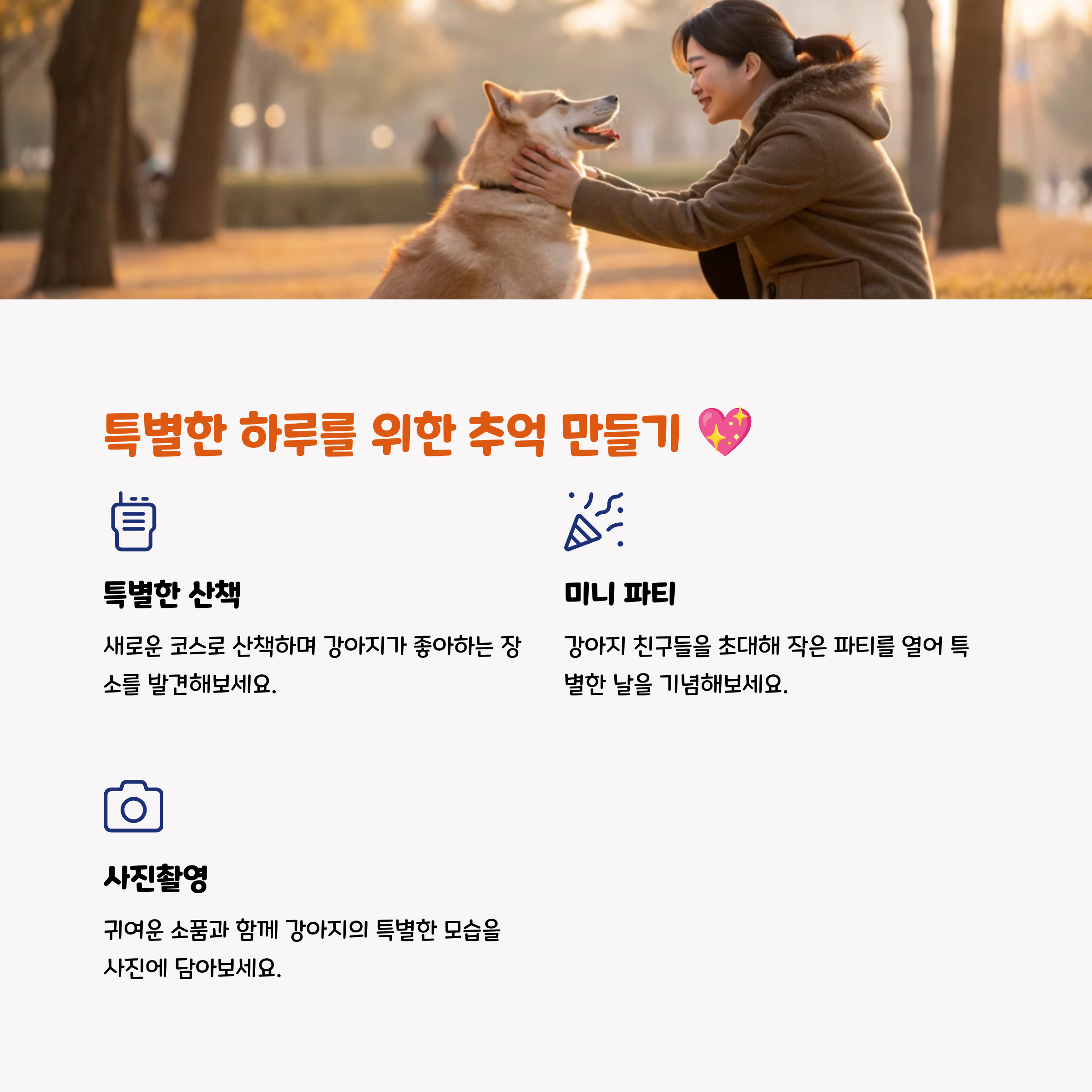 특별한 하루를 보내고 나면 우리 강아지도 행복하고, 보호자도 뿌듯한 하루가 될 거예요! 💖