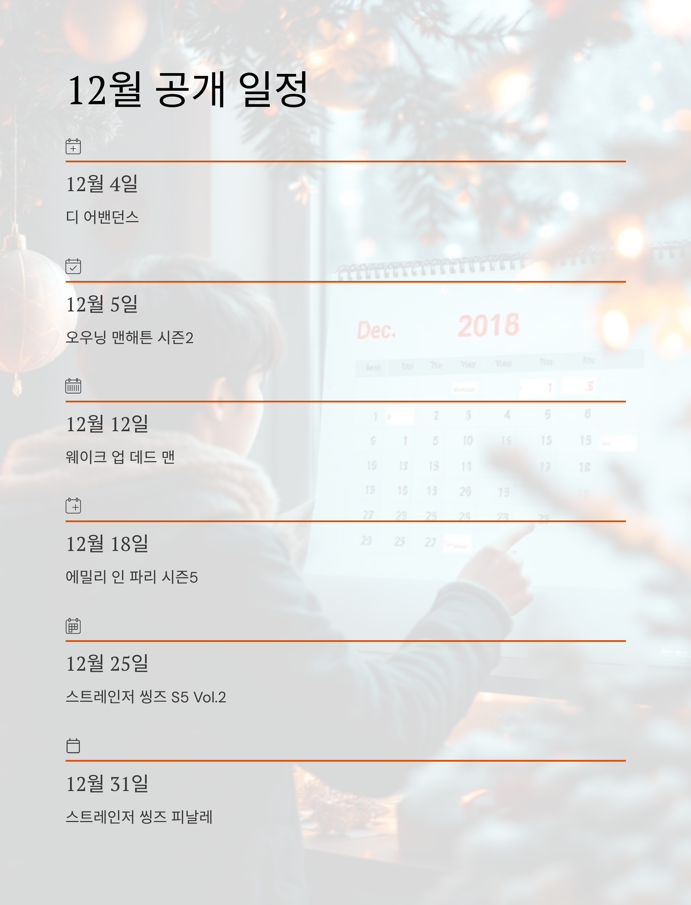 넷플릭스의 12월 신작들을 하나하나 소개하며 저도 리스트를 새로 정리하게 되었어요.