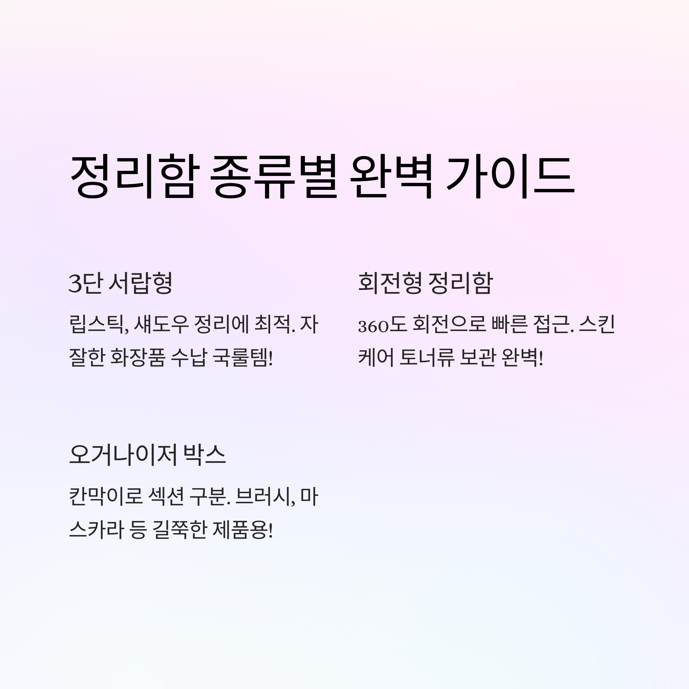 | 회전형 정리함 | 360도 회전으로 빠른 접근 | 스킨케어/토너류 보관 |