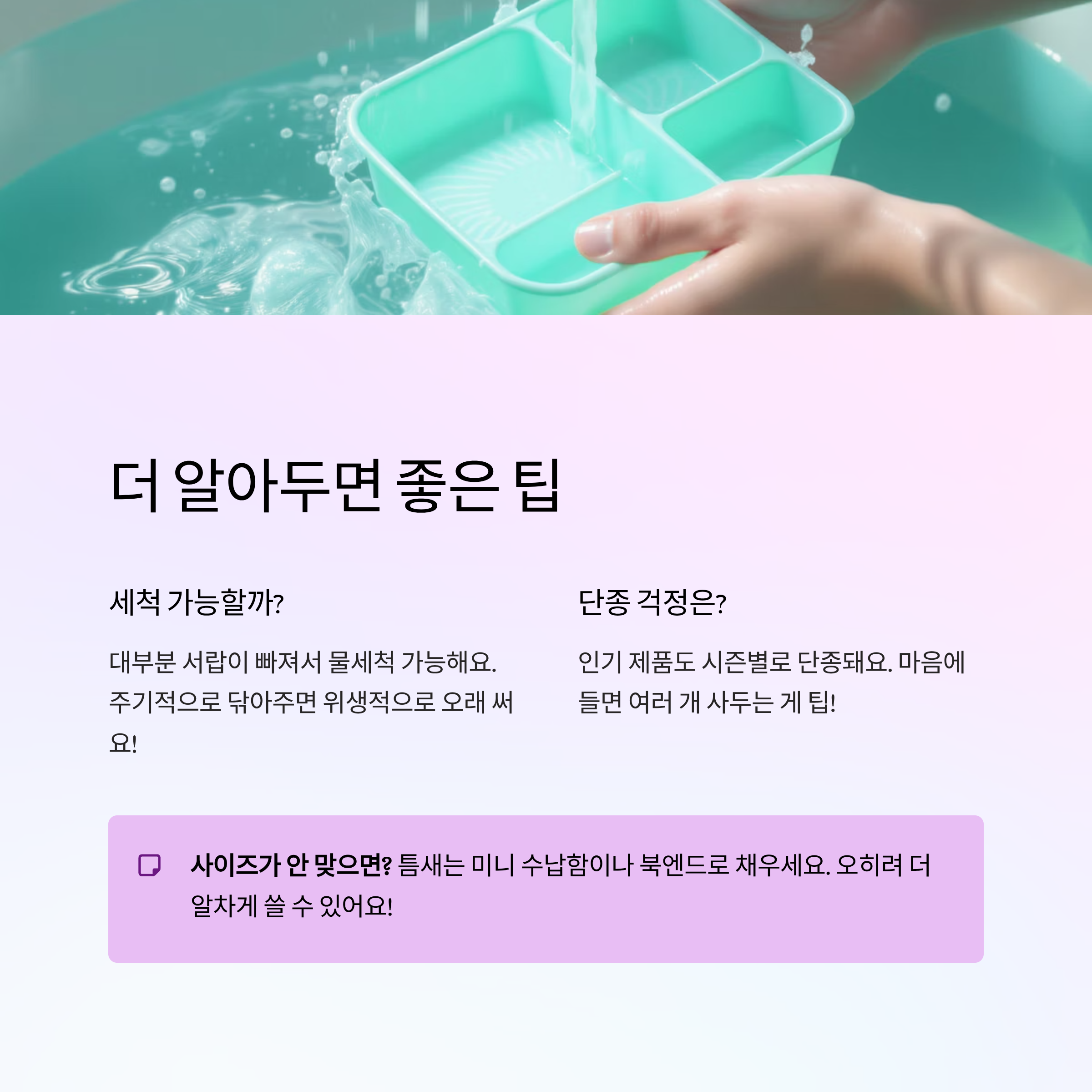네, 대부분의 다이소 정리함은 서랍이 빠져서 물세척이 가능해요. 주기적으로 닦아주면 위생적으로 오래 쓸 수 있어요.