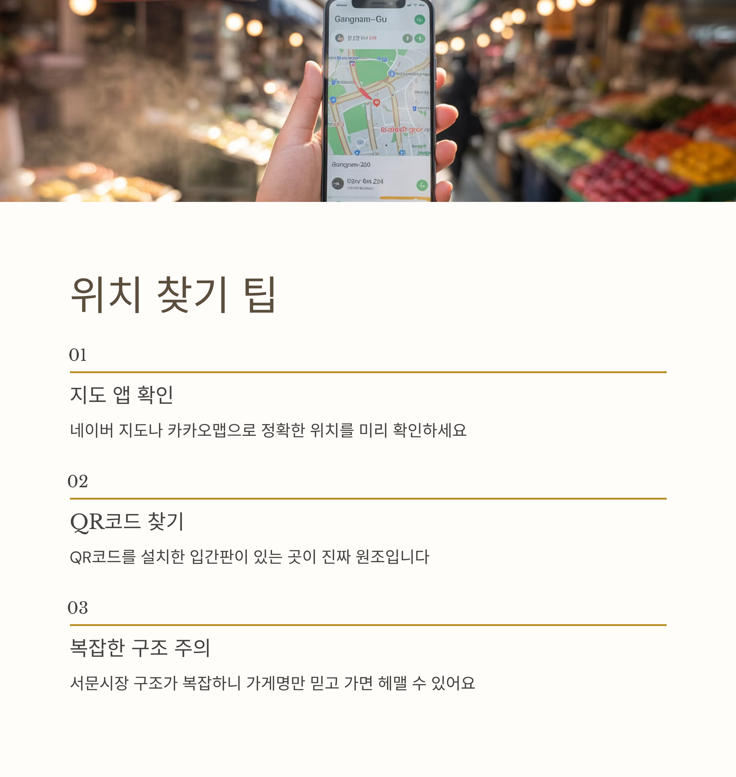 서문시장이 넓어서 위치를 미리 지도앱(네이버, 카카오)으로 확인하고 가는 것이 좋습니다. 입간판 QR코드 확인도 팁이에요.