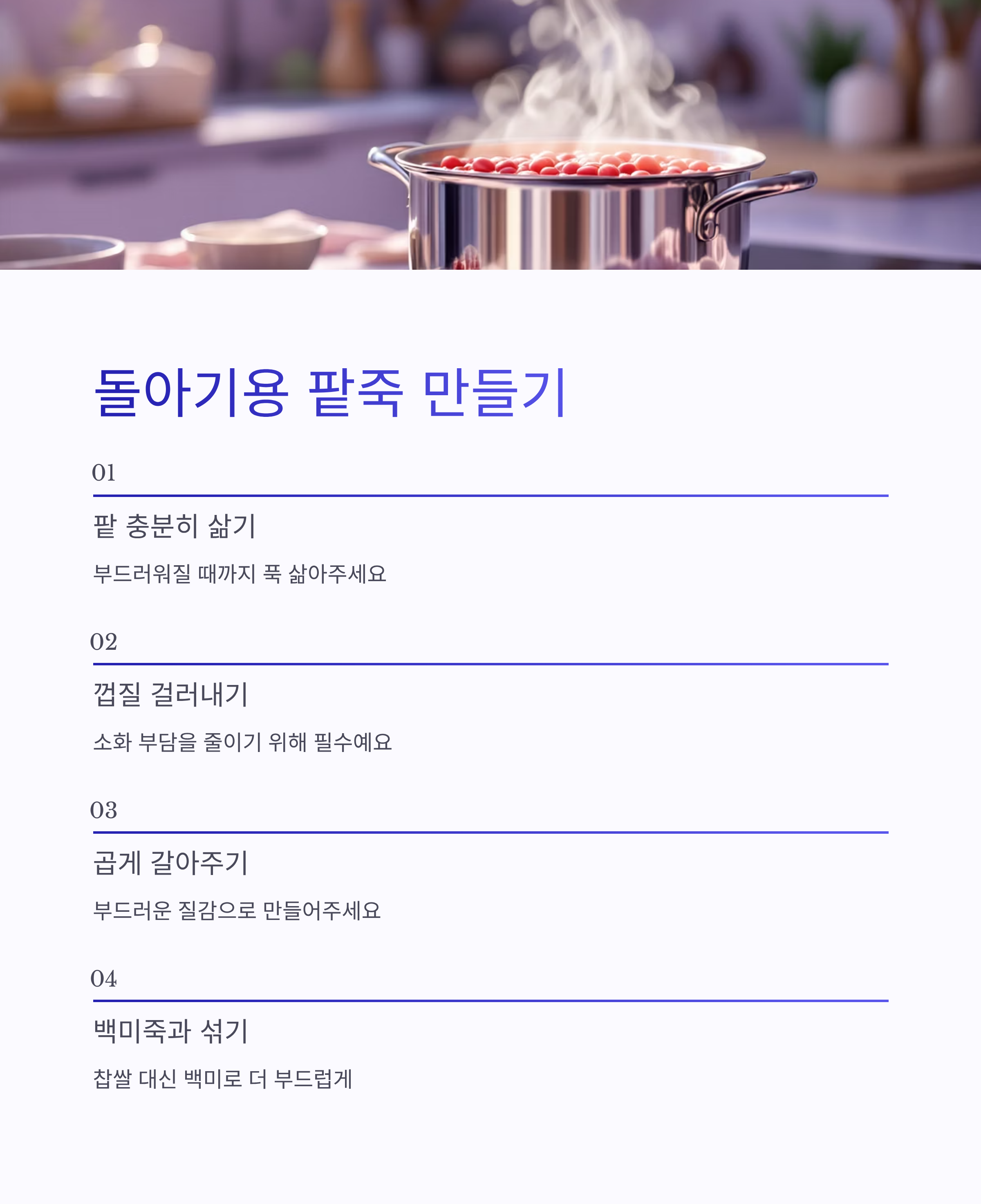 돌아기를 위한 팥죽은 가능한 한 부드럽고 자극적이지 않아야 해요.