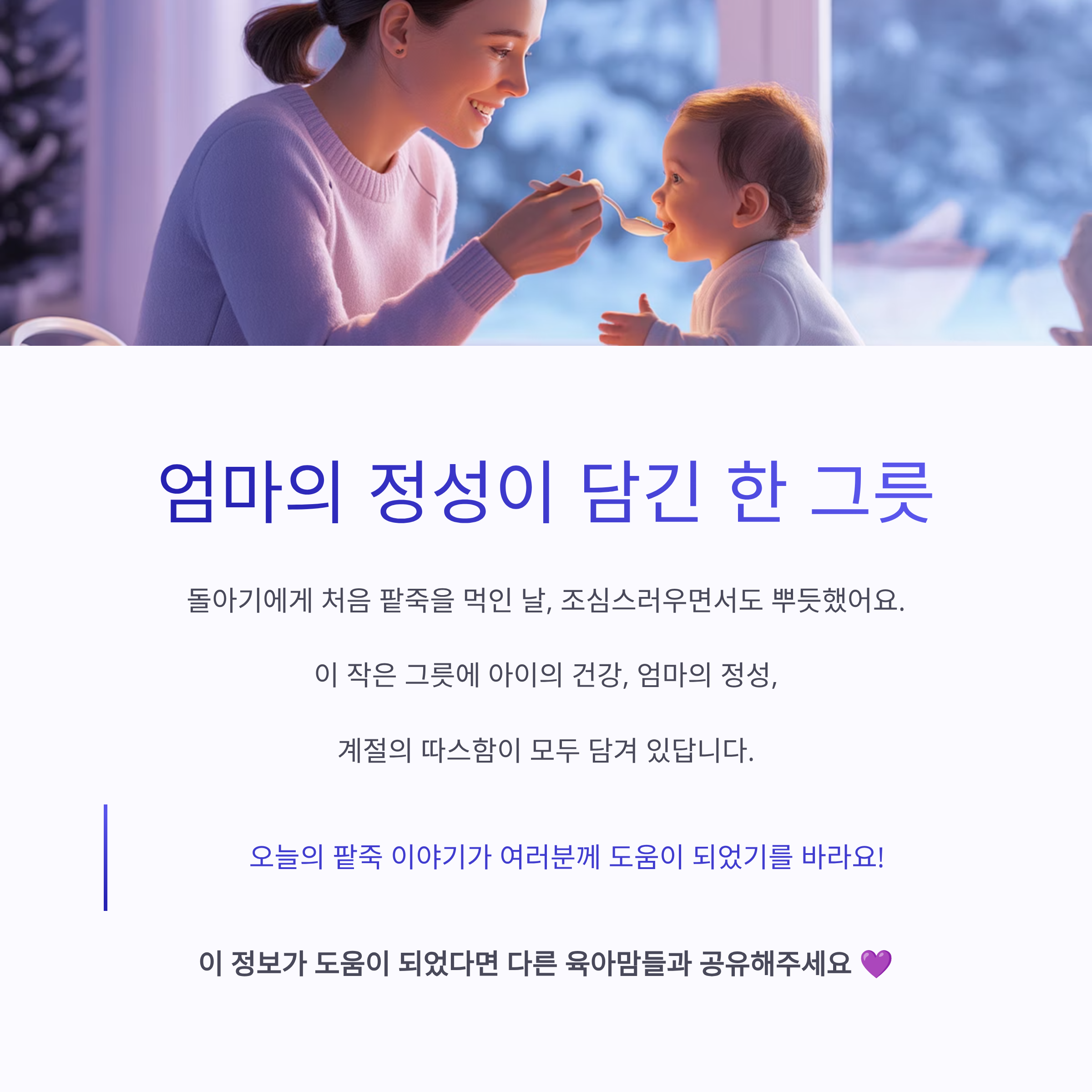 돌아기에게 처음으로 팥죽을 먹인 날, 조심스러우면서도 뭔가 뿌듯한 기분이 들었어요.