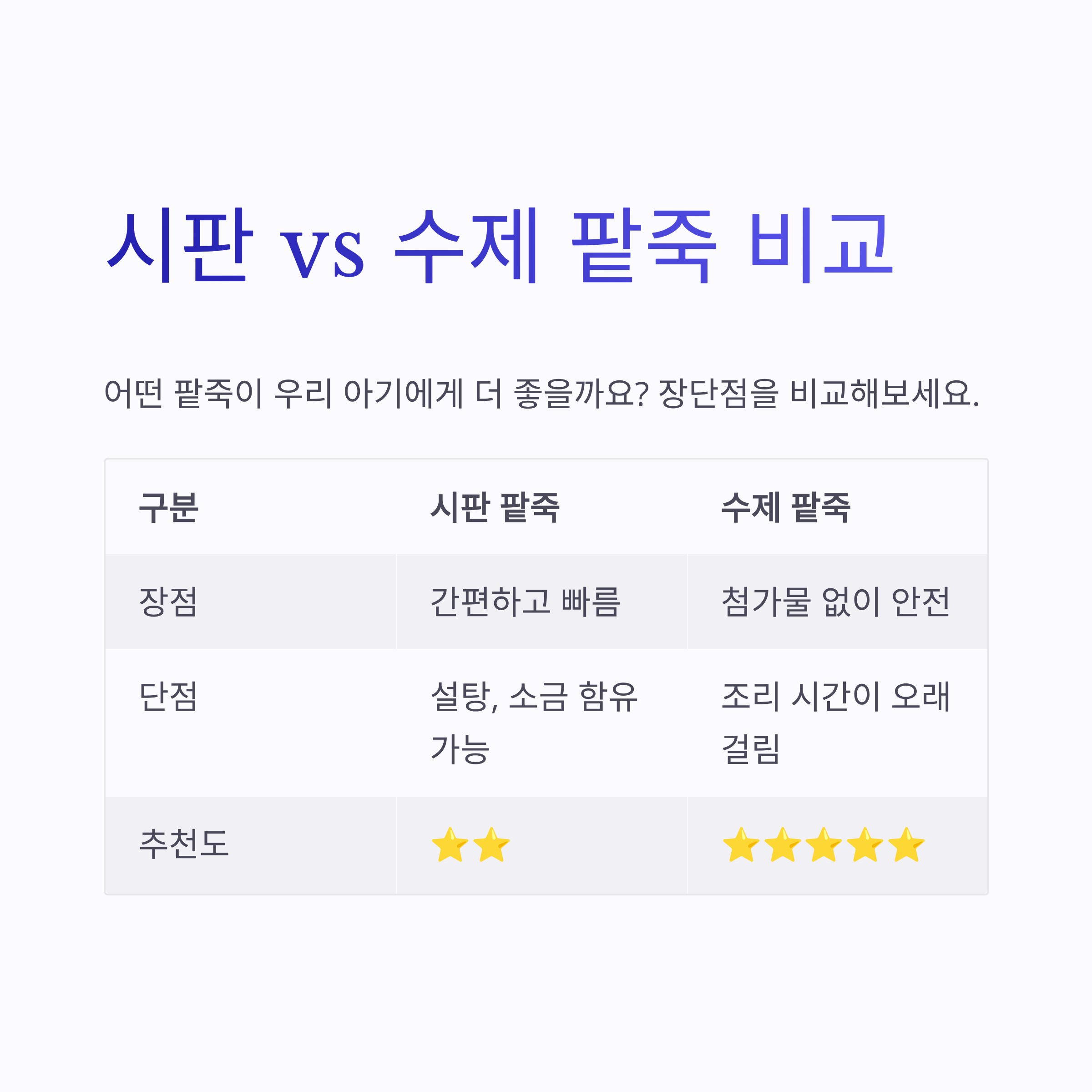 | 장점 | 간편하고 빠름 | 첨가물 없이 안전 |