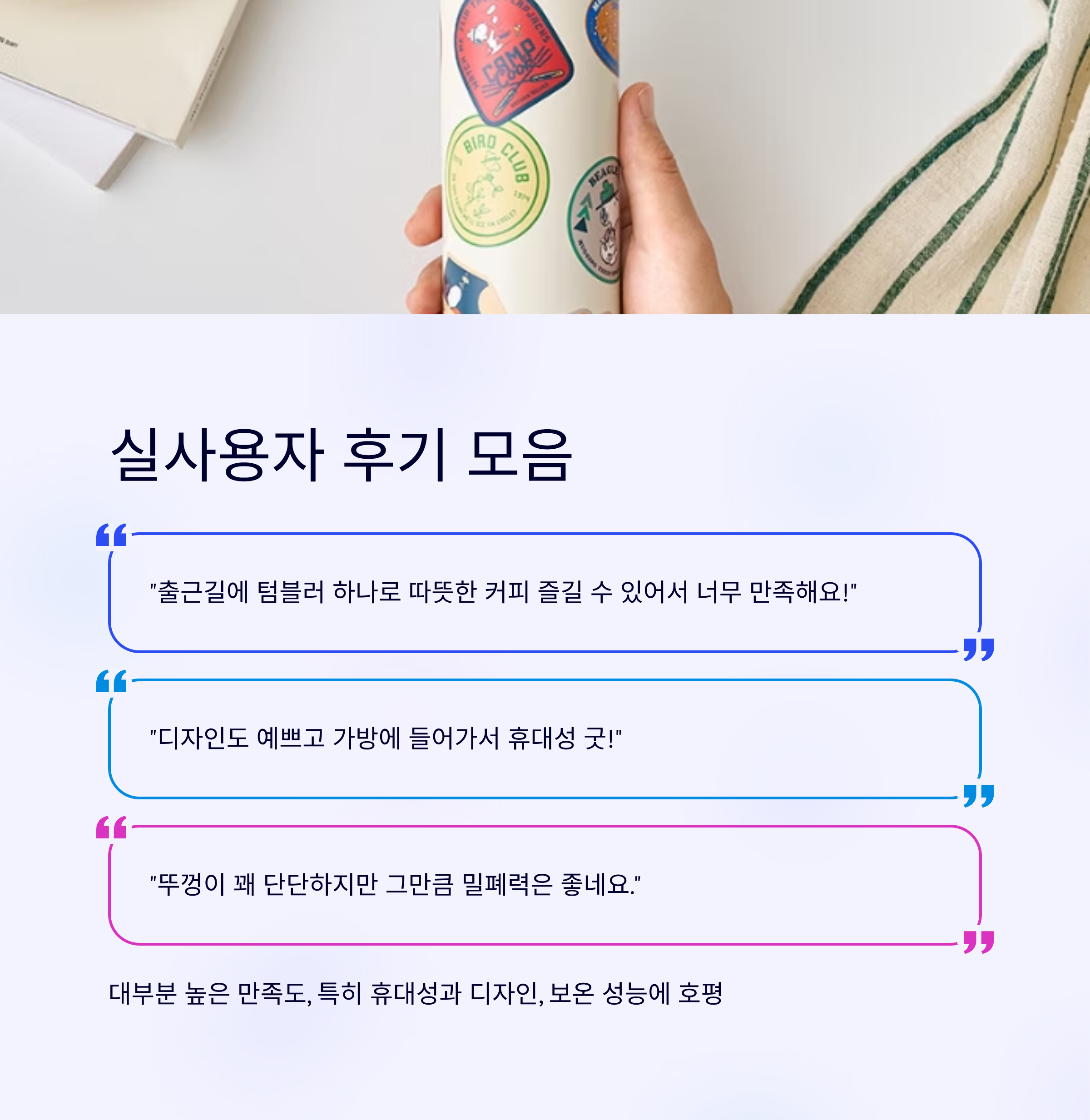 대부분 높은 만족도를 보였고, 특히 휴대성과 디자인, 보온 성능에 대한 호평이 많았어요.