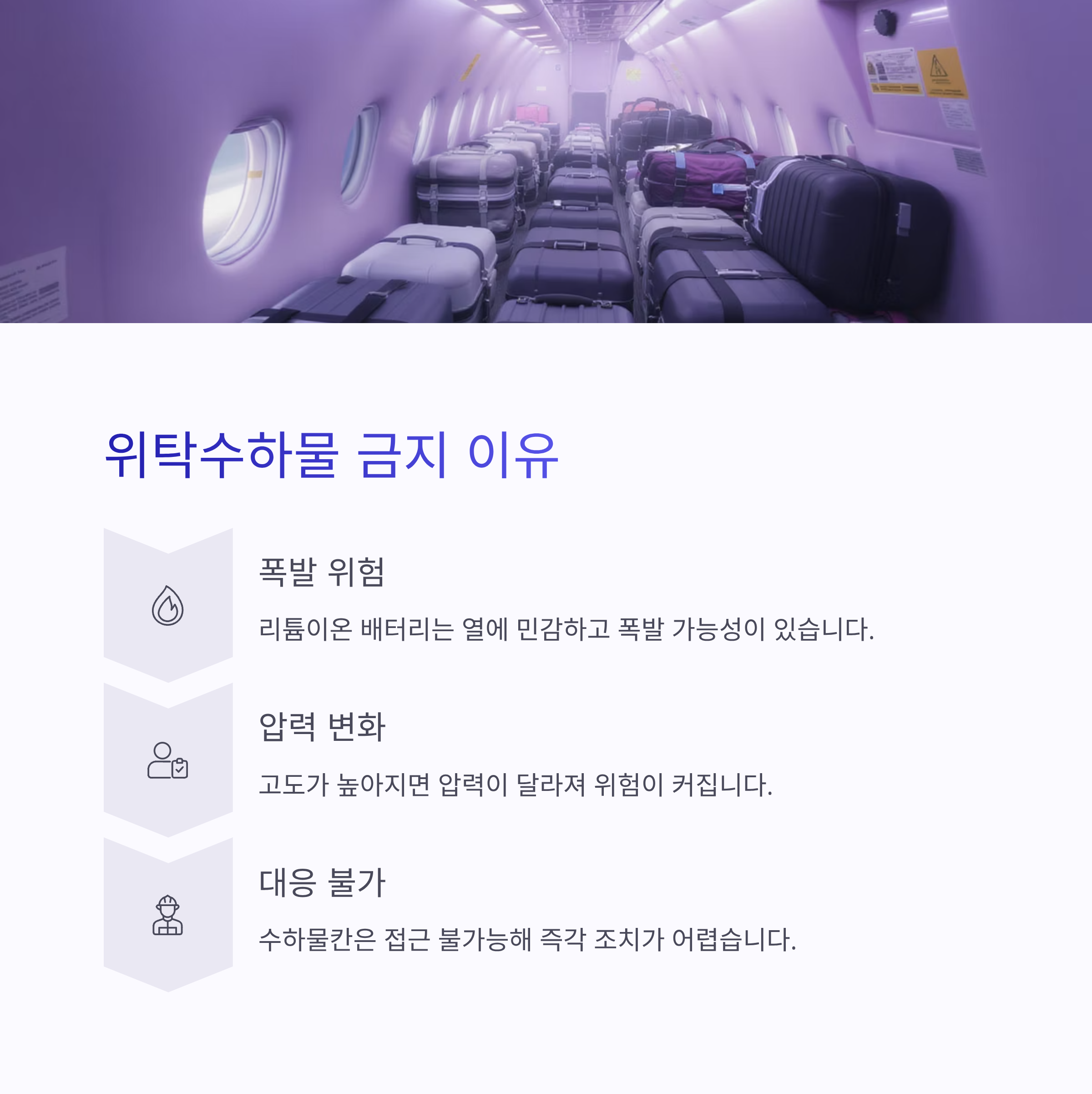 - 기내라면 바로 조치가 가능하지만, 수하물칸은 대응이 불가능해요.
