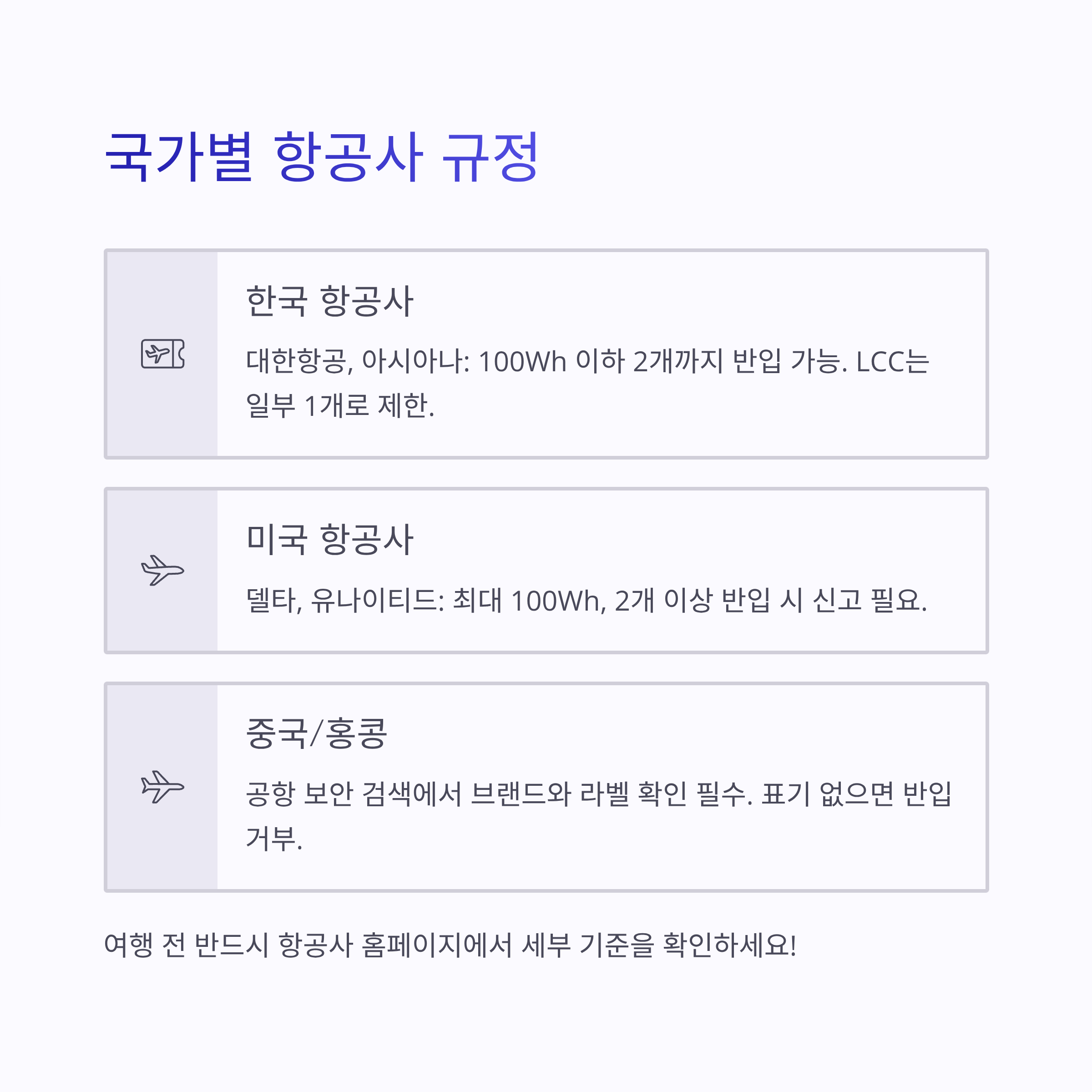- 미국 항공사(델타, 유나이티드 등): 최대 100Wh, 2개 이상 반입 시 신고 필요
