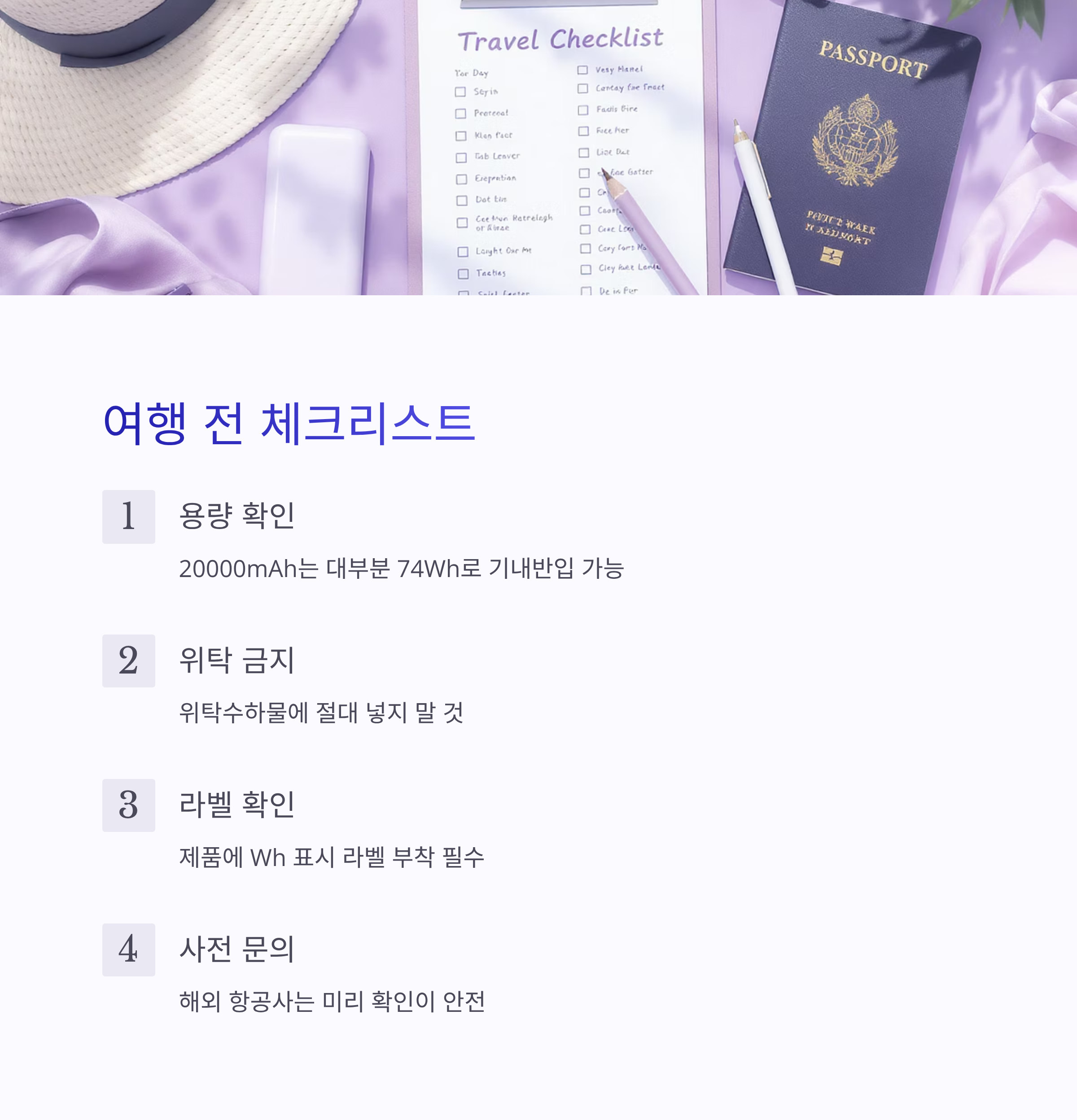 - 20000mAh 보조배터리는 대부분 기내반입 가능 (74Wh 기준)