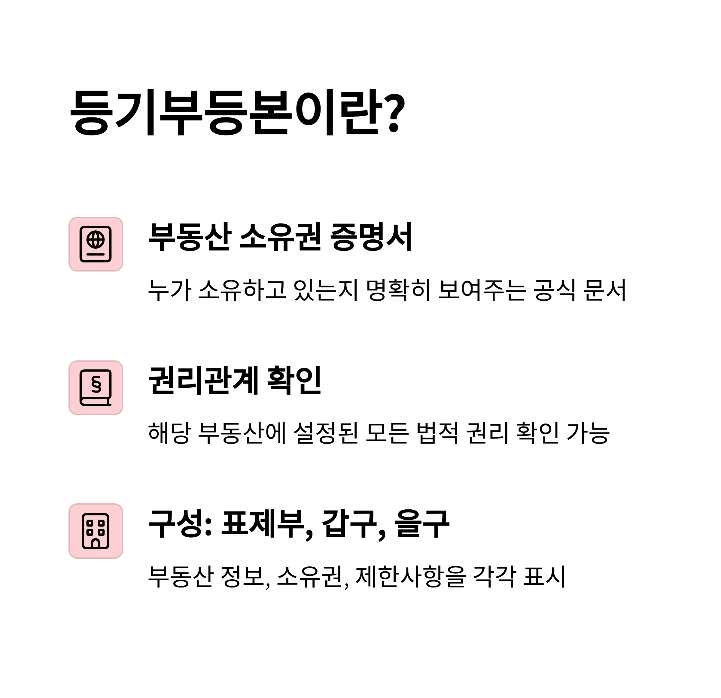 등기부등본은 크게 다음과 같은 정보로 구성됩니다