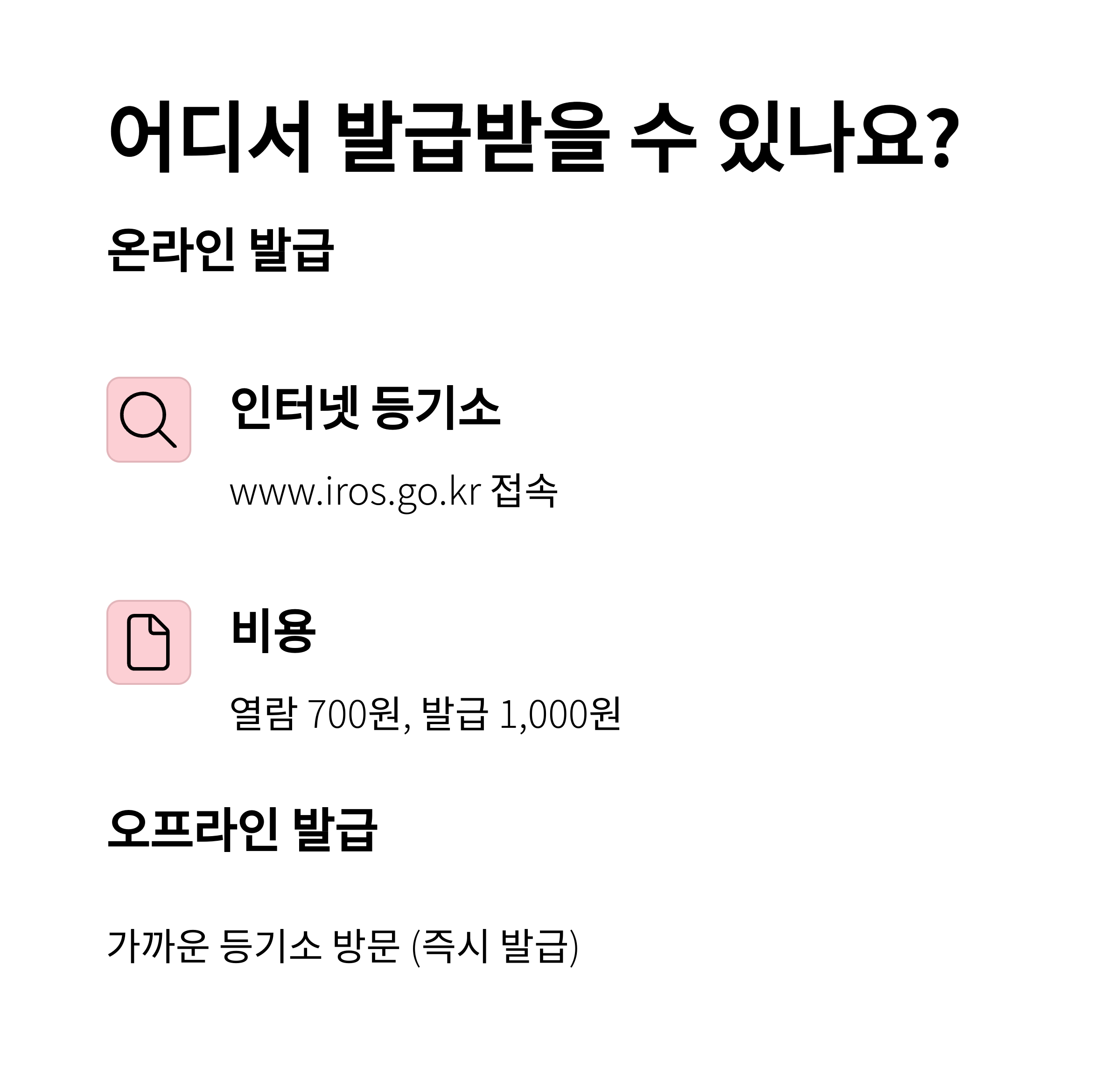 | 발급 방법 | 수수료 | 처리 시간 |