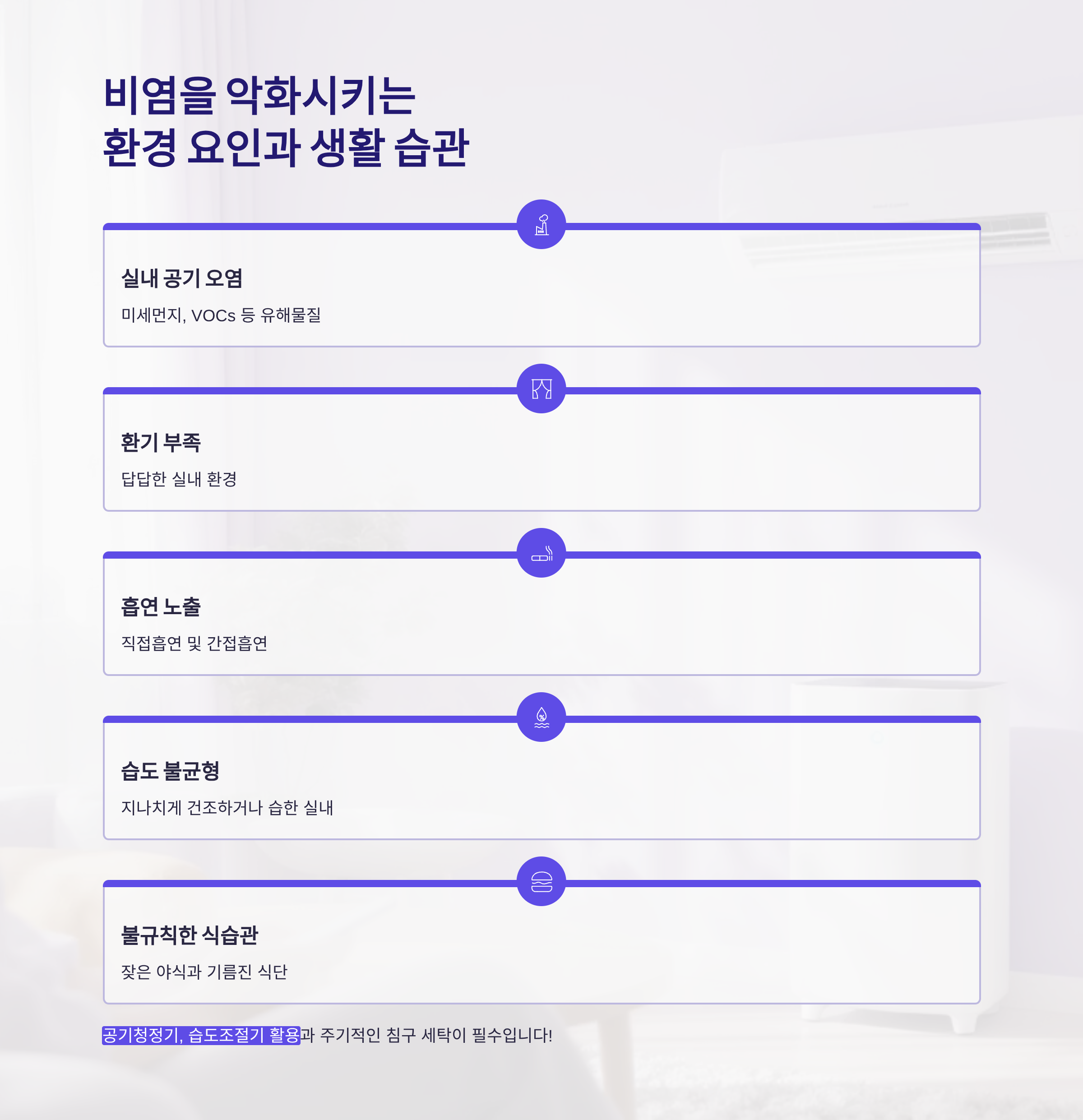 비염은 외부 환경과 생활 습관의 영향을 크게 받아요. 특히 아래와 같은 요소들이 비염을 유발하거나 악화시킬 수 있습니다.