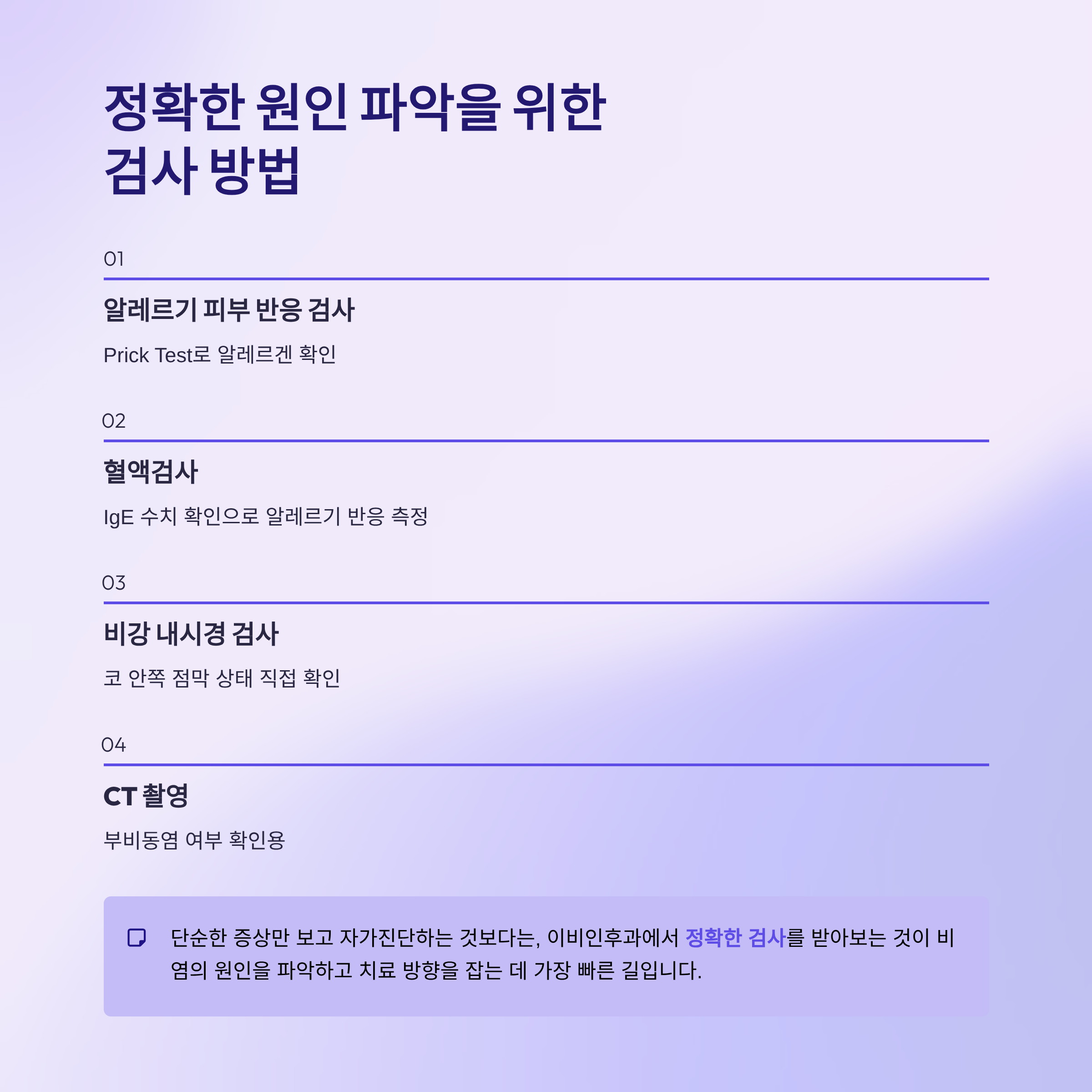 이비인후과에서 정확한 검사를 받아보는 것이 비염의 원인을 파악하고 치료 방향을 잡는 데 가장 빠른 길입니다.