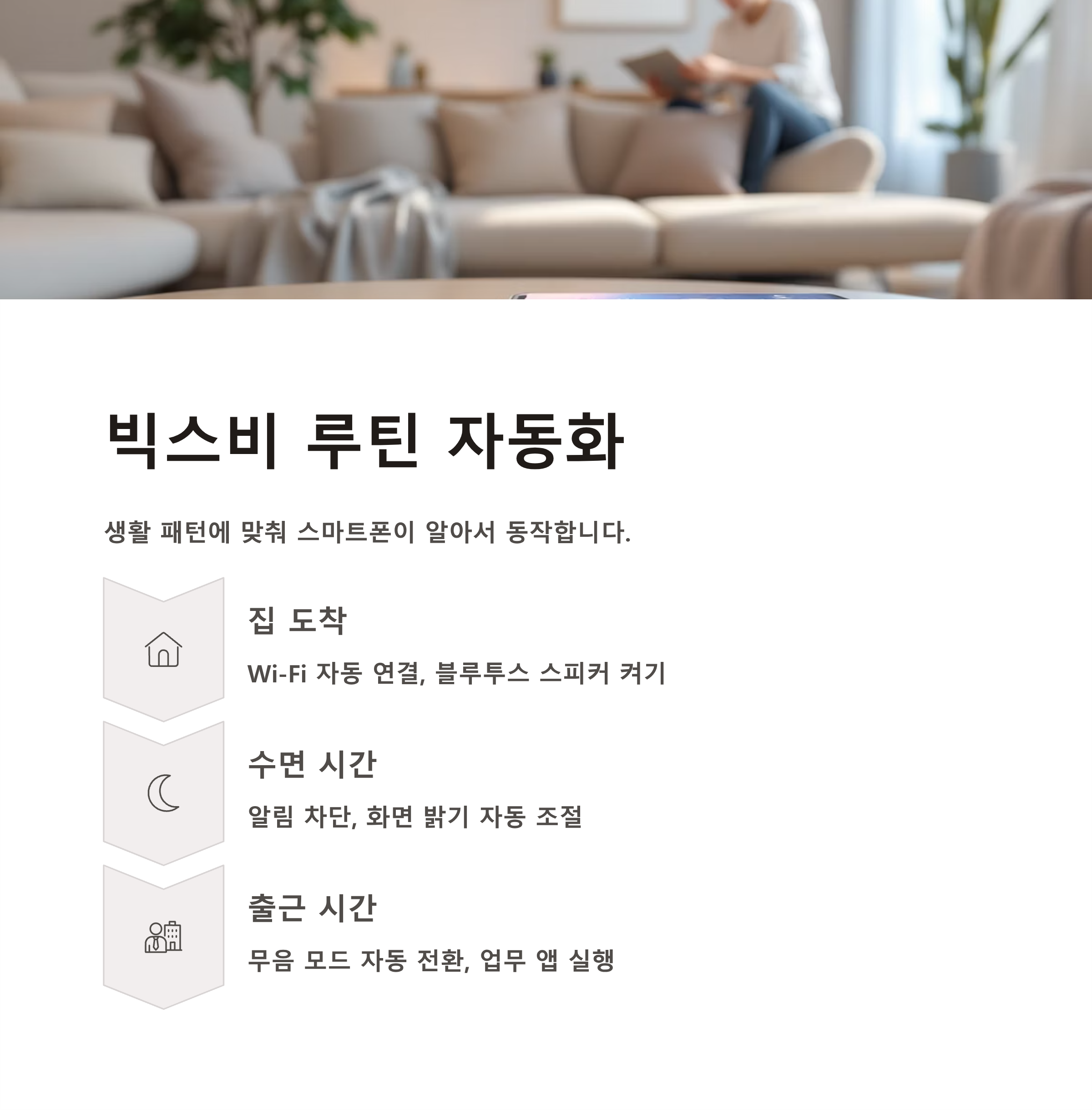 갤럭시의 자동화 기능인 빅스비 루틴을 활용하면 사용자의 생활 패턴에 따라 스마트폰이 알아서 동작합니다.