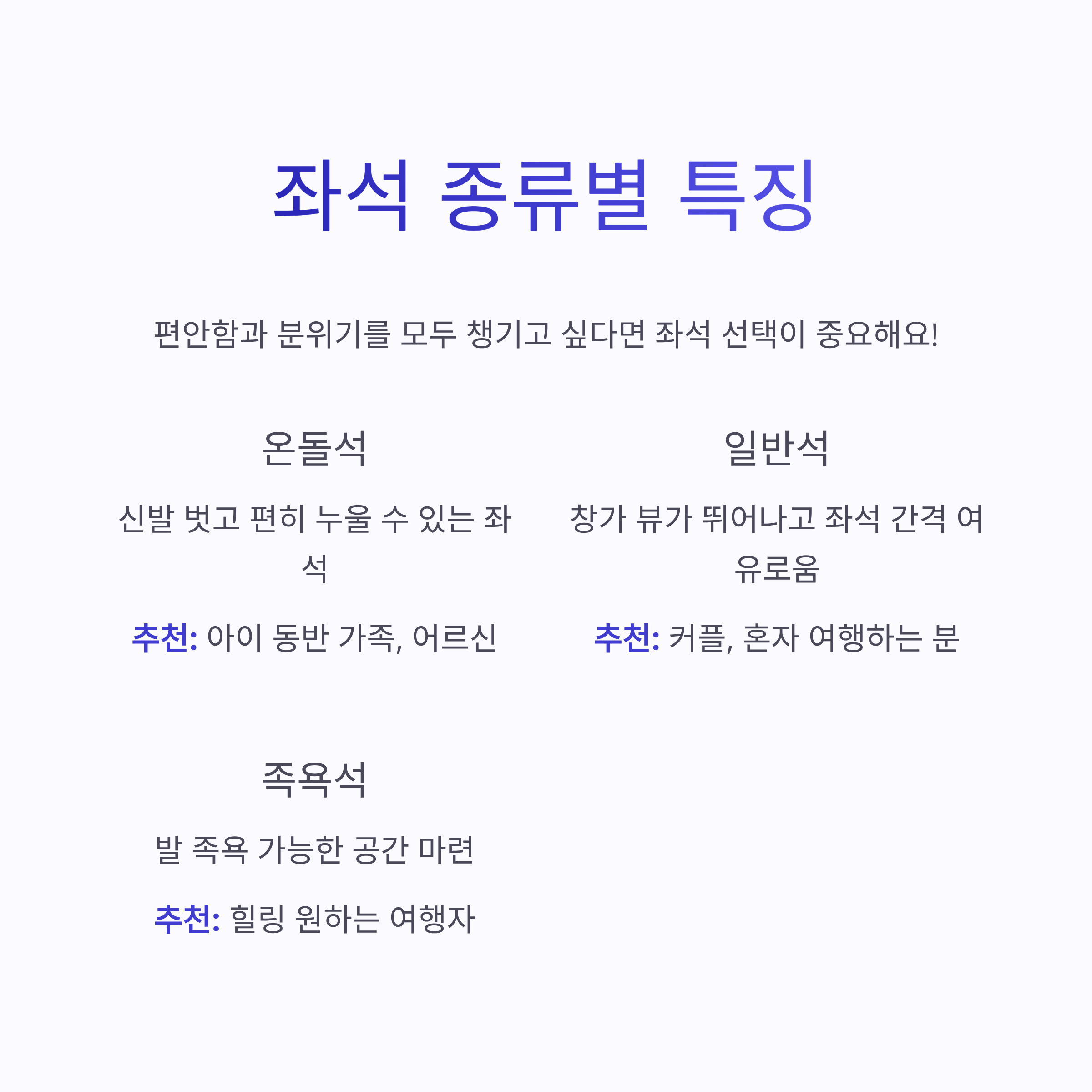 | 일반석 | 창가 뷰가 뛰어나고 좌석 간격 여유로움 | 커플, 혼자 여행하는 분 |