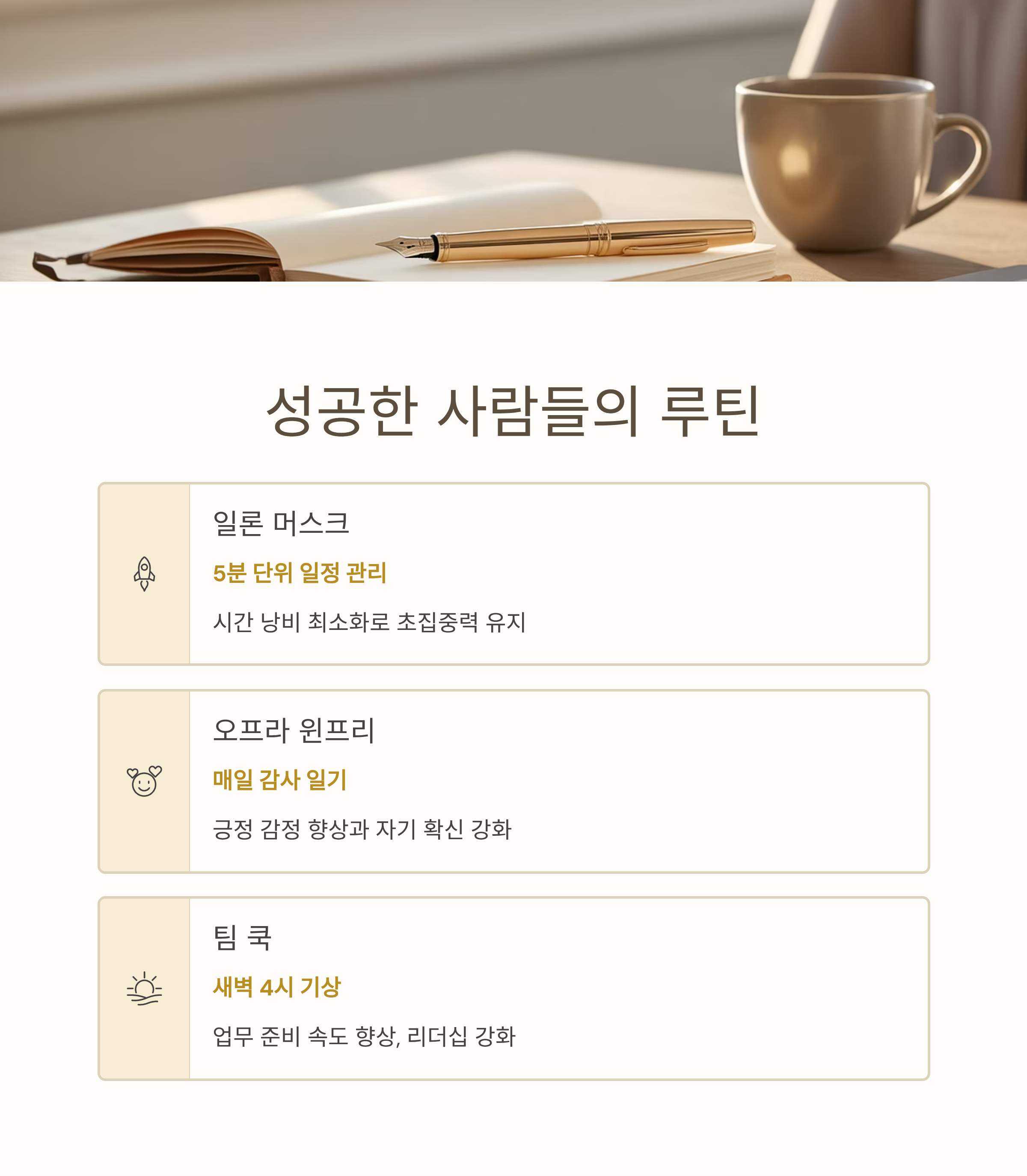 특히 아침 기상, 운동, 독서, 기록 등 일상의 기본 루틴은 생각보다 엄청난 차이를 만들어냅니다.