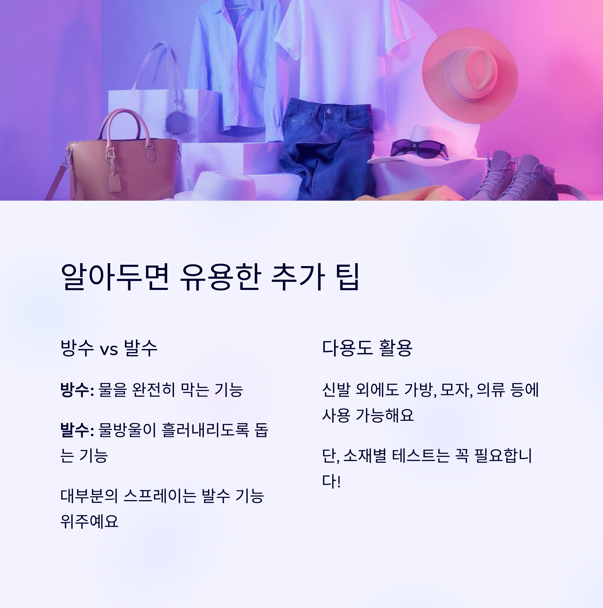 방수스프레이도 다 같은 게 아니에요! 용도와 소재에 따라 선택이 달라져야 해요. 아래 표에서 간단히 비교해볼게요.