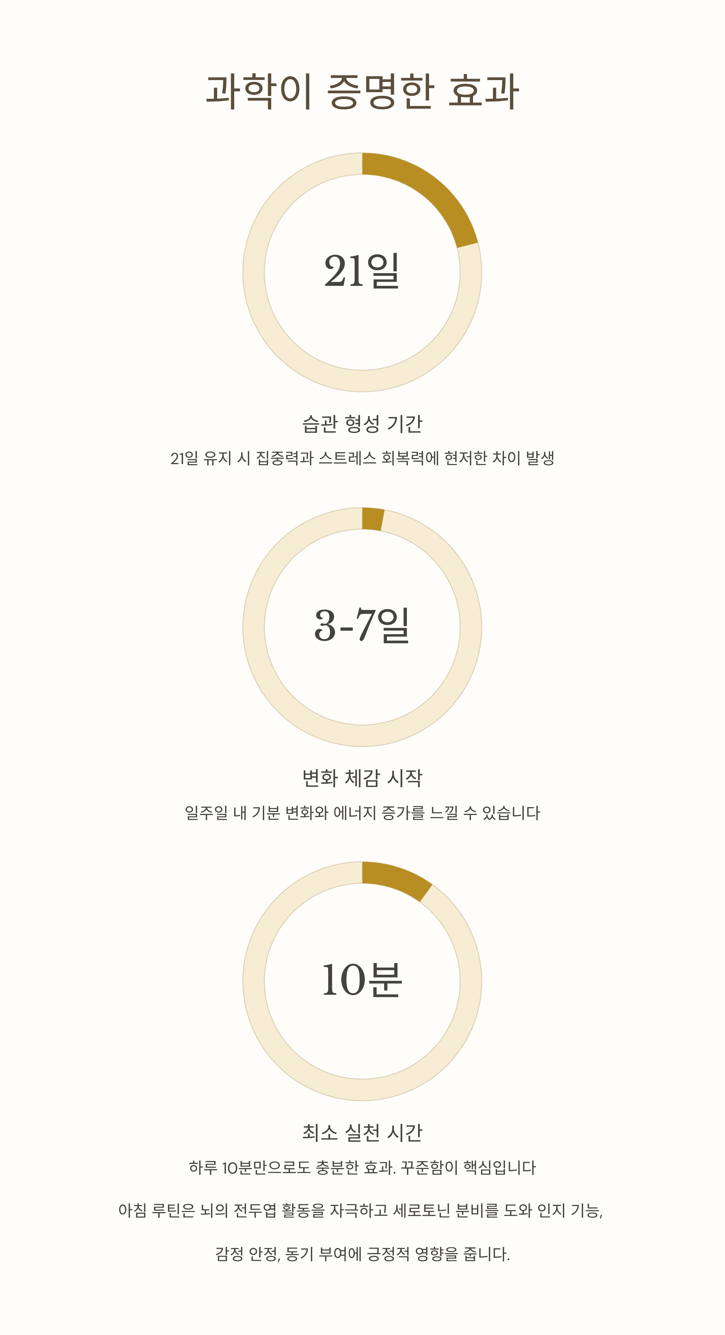 10분만 해도 충분해요. 중요한 건 '매일 한다는 것'. 루틴의 길이보다 꾸준함이 더 큰 변화를 만듭니다.