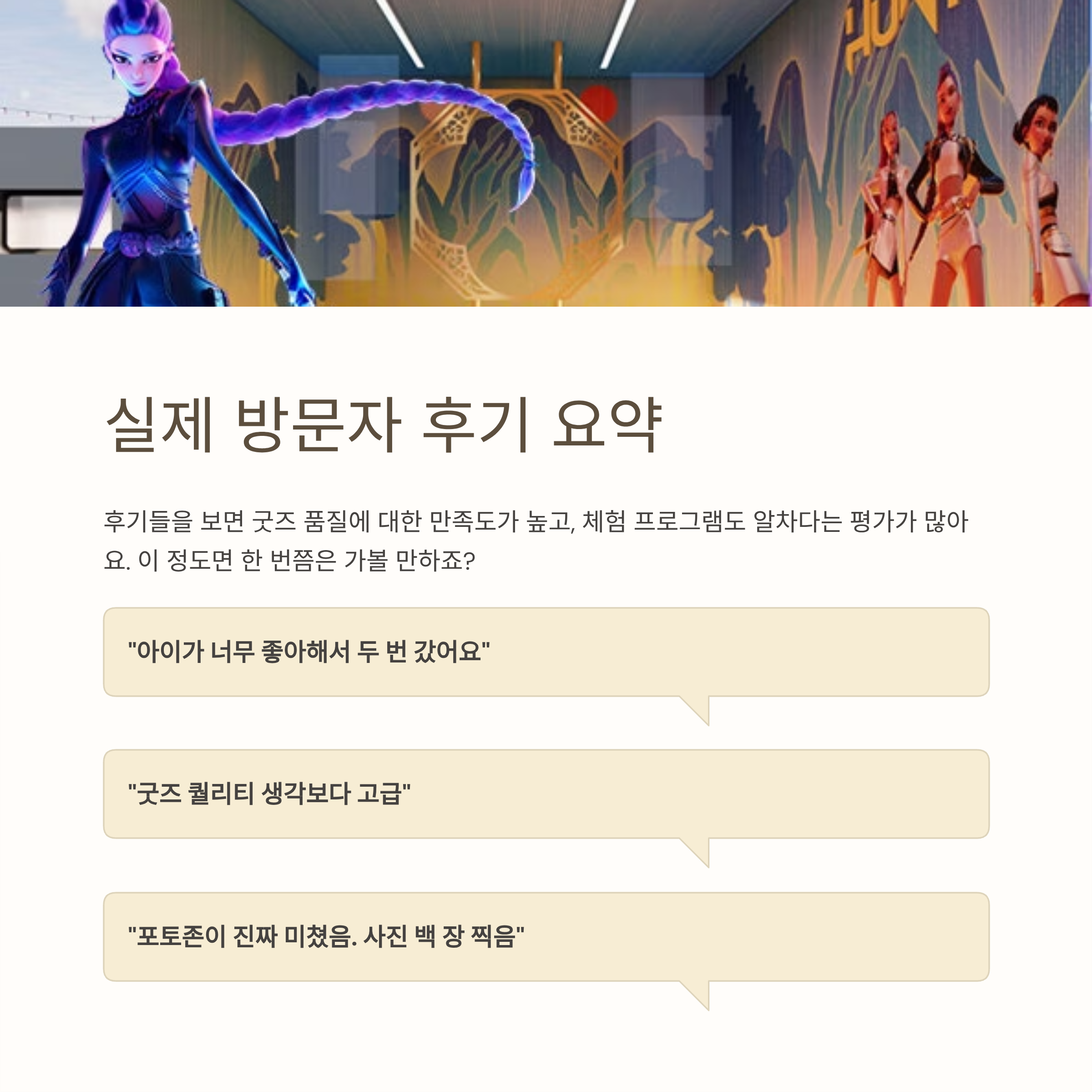 방문자 후기를 보면 굿즈 품질과 체험 프로그램에 대한 만족도가 특히 높습니다.