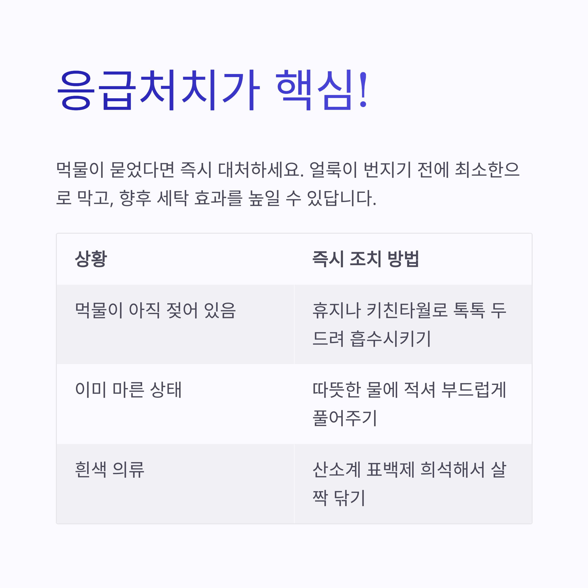 얼룩이 번지기 전에 최소한으로 막고, 향후 세탁 효과를 높여줄 수 있답니다.
