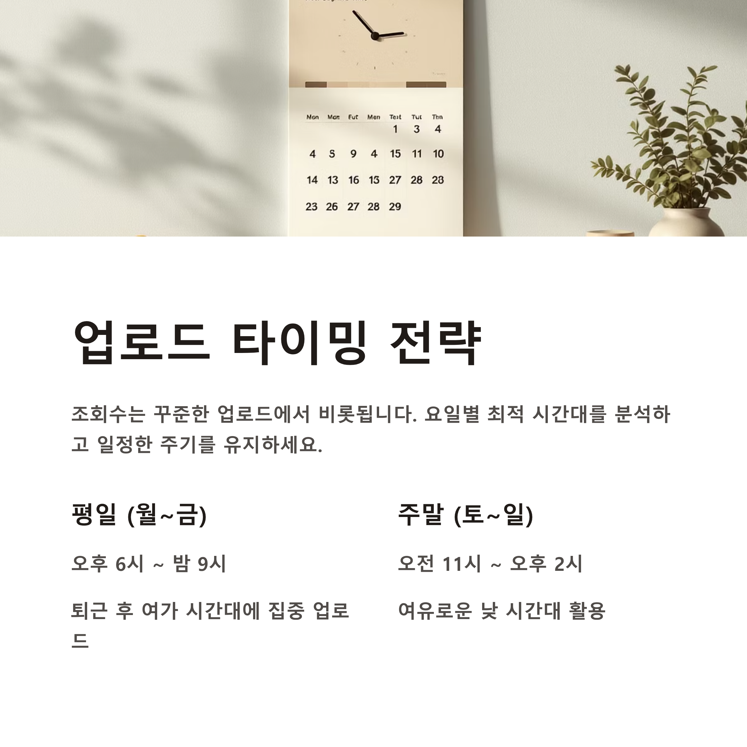 특히 요일별로 조회수가 높은 시간대를 분석하고, 일정한 업로드 주기를 유지하는 것이 중요해요.