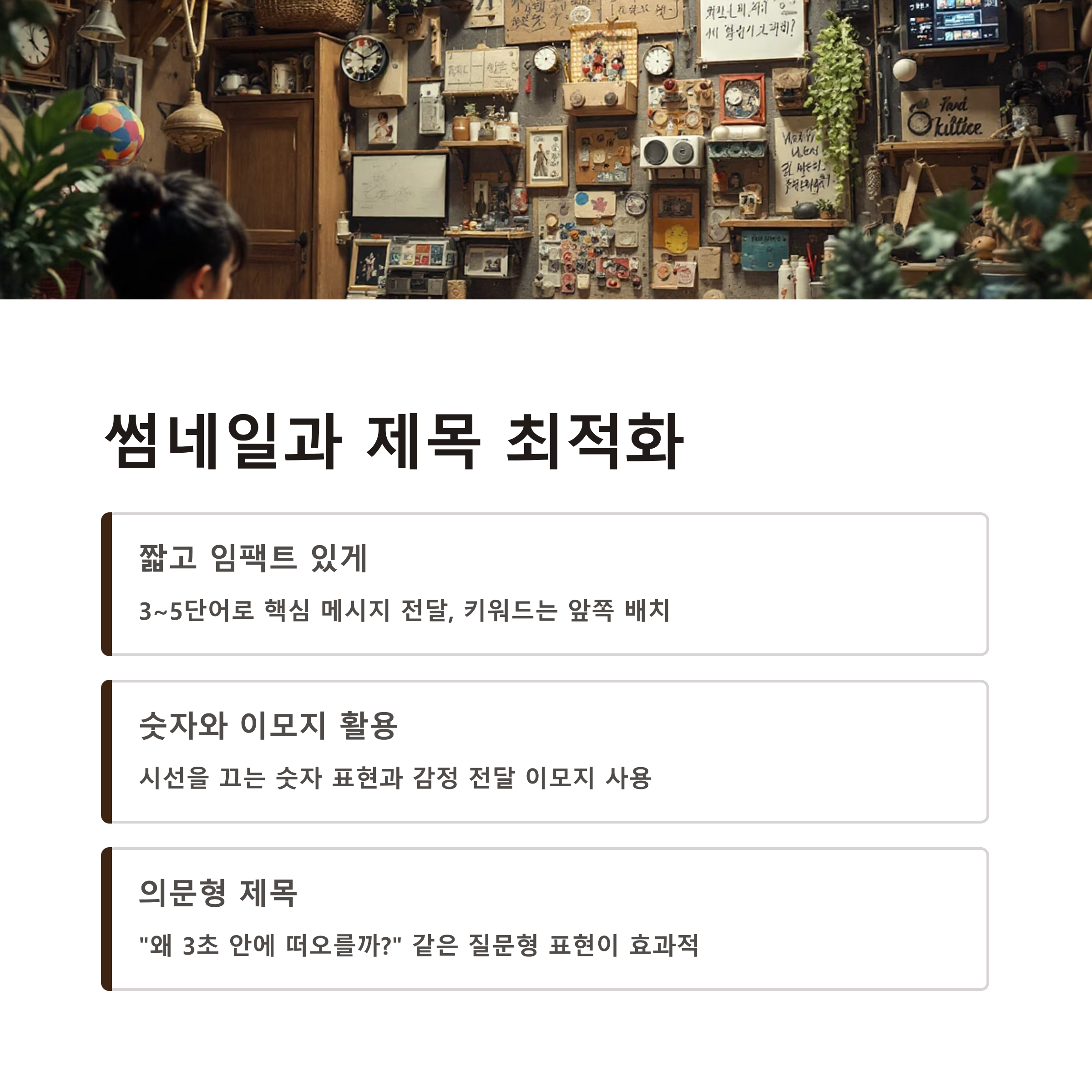 짧고 임팩트 있는 문장이 필수이며, 숫자나 질문형 표현이 효과적입니다.