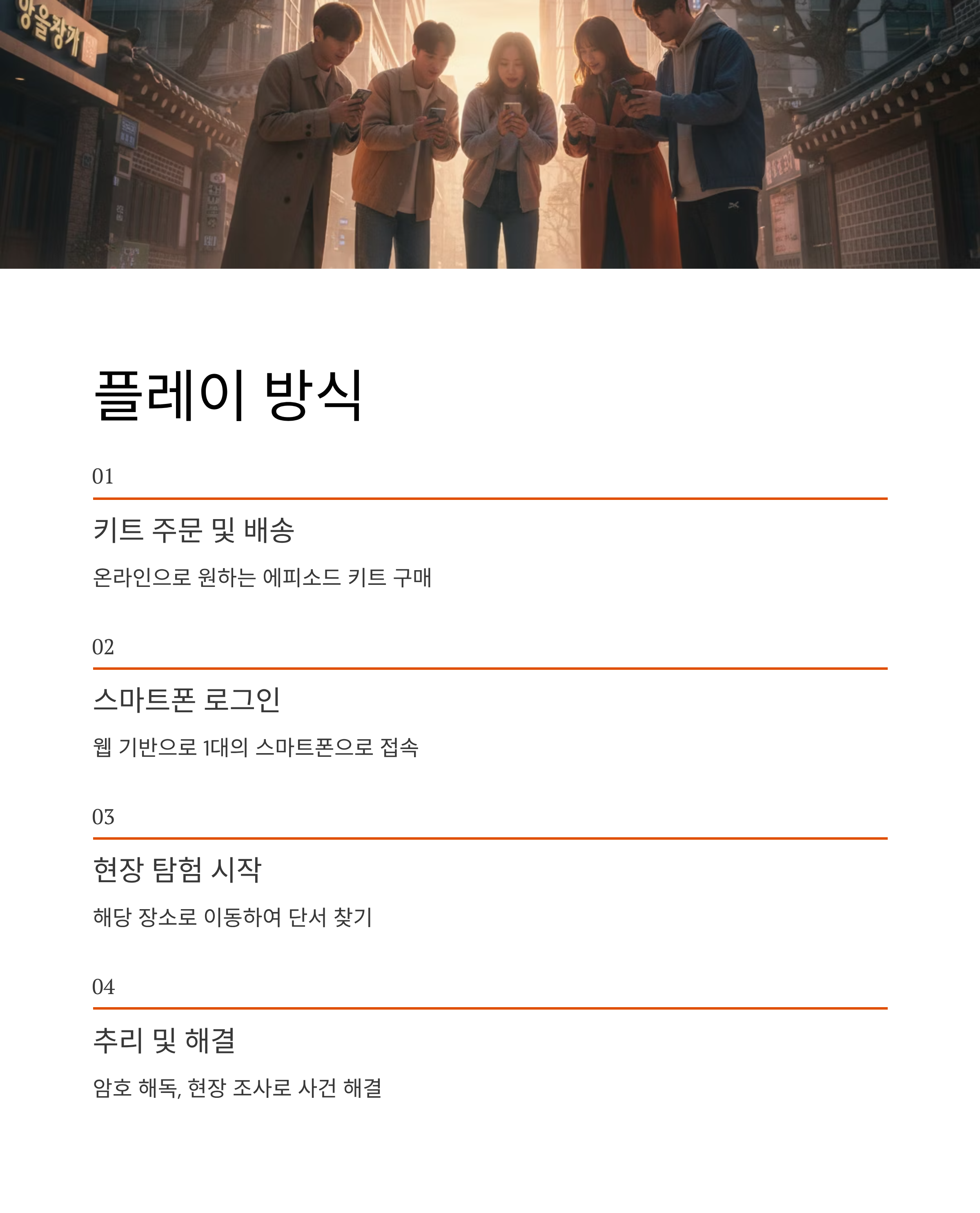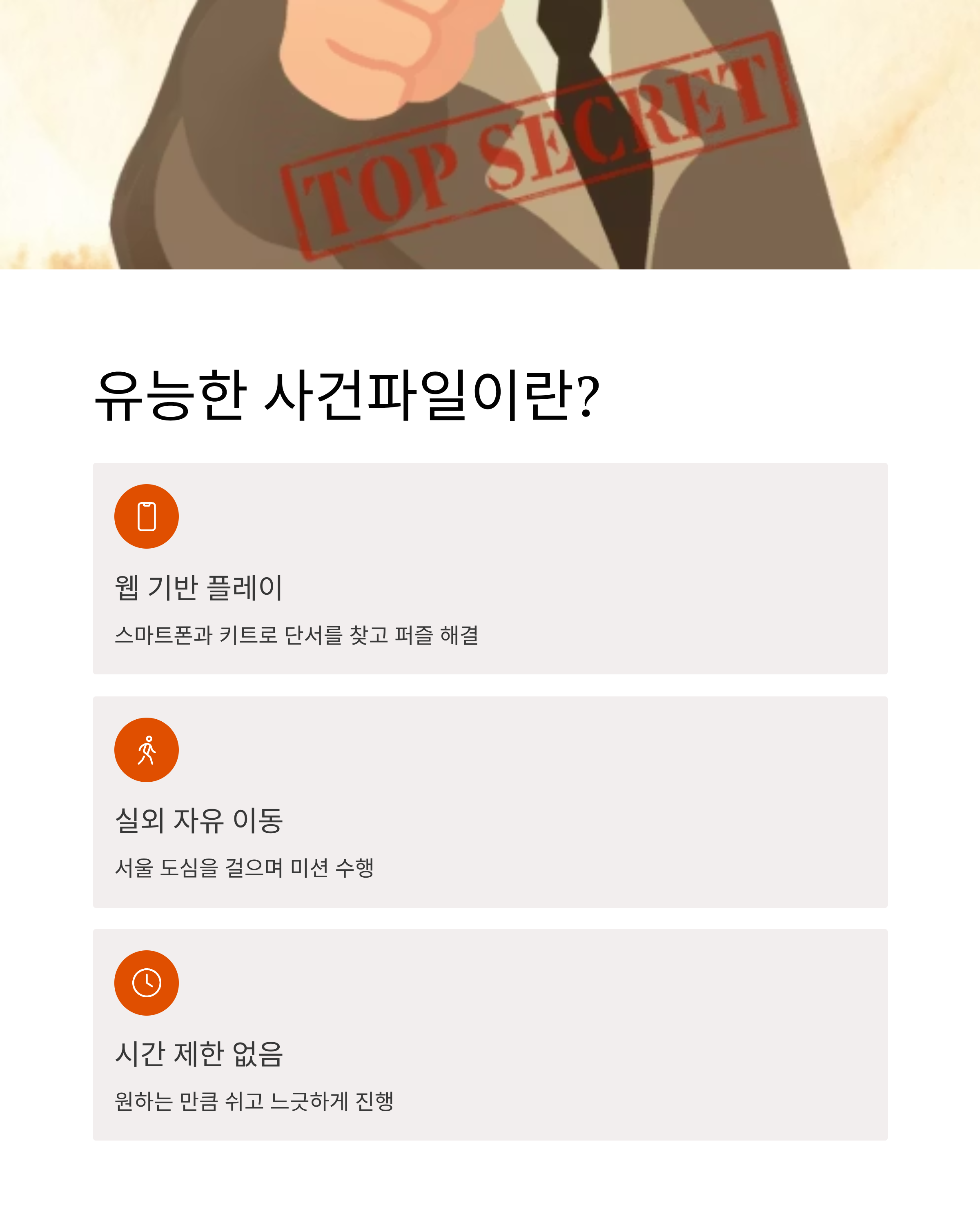 유능한 사건파일은 야외 방탈출 + 추리 + 키트가 결합된 웹 기반 게임입니다.