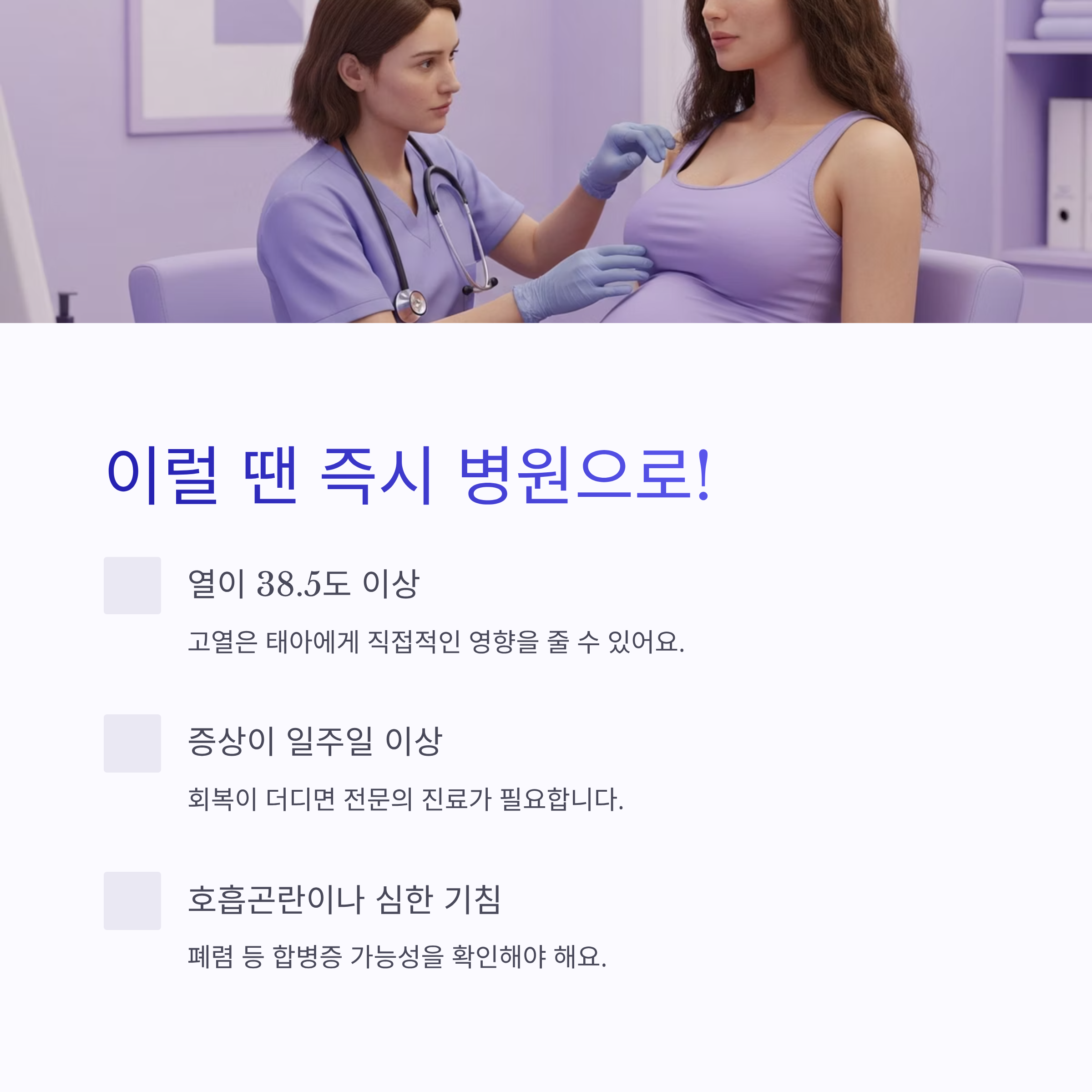 또 열이 살짝만 나도 태아에게 영향을 줄 수 있다 보니, 증상이 가볍더라도 민감하게 대응할 필요가 있어요.
