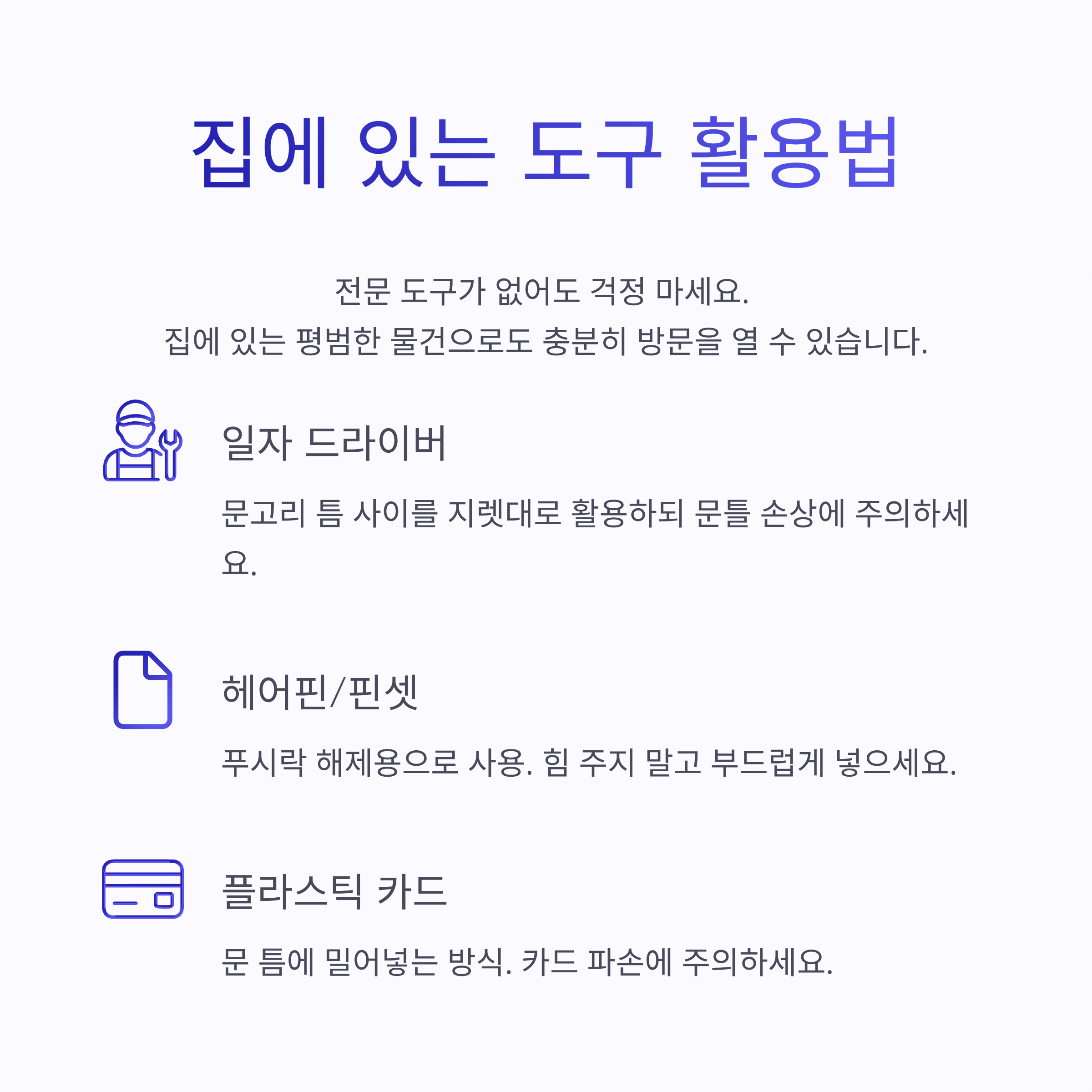 전문 도구가 없어도 걱정 마세요. 집에 있는 평범한 물건으로도 충분히 방문을 열 수 있어요.