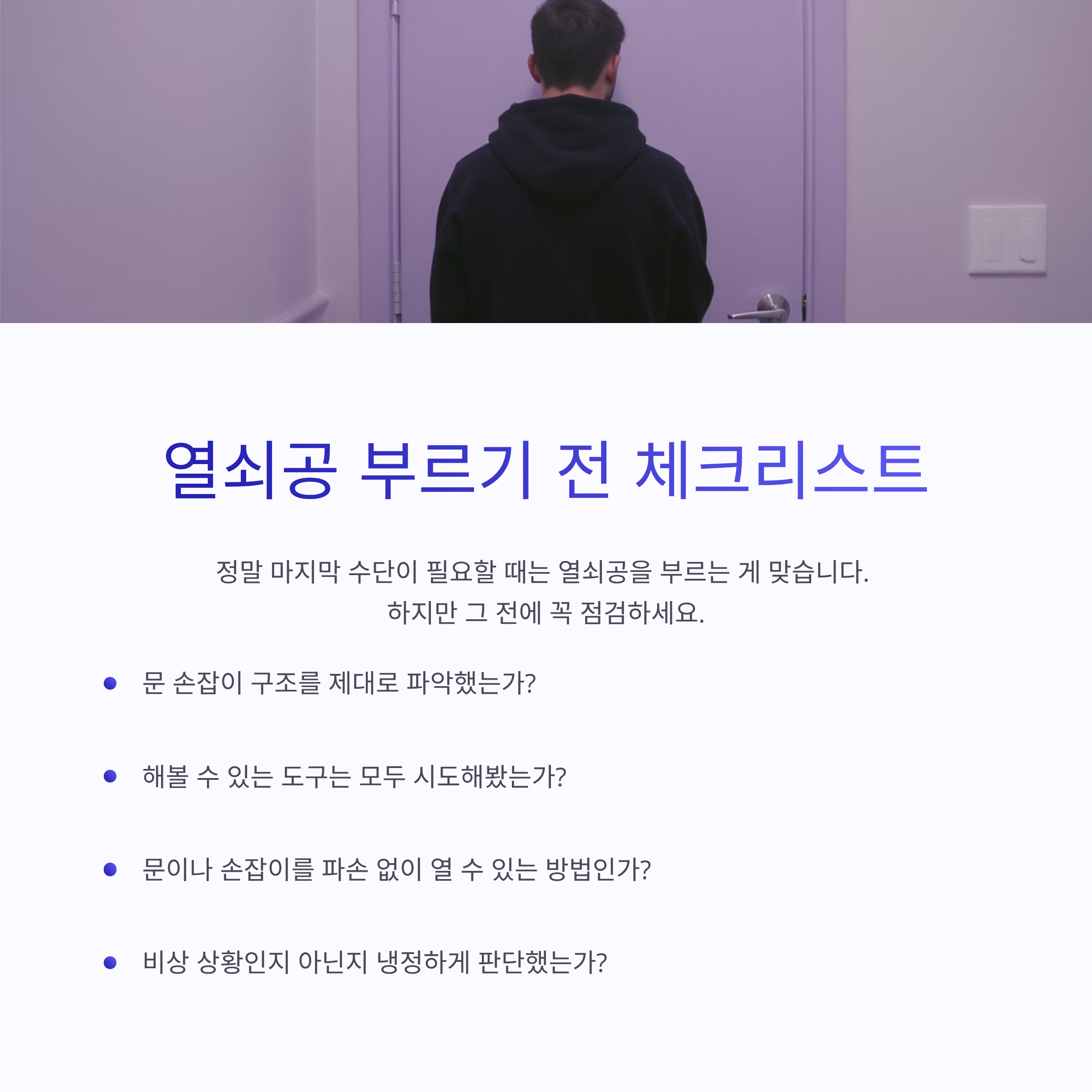 정말 마지막 수단이 필요할 때는 열쇠공을 부르는 게 맞습니다. 하지만 그 전에 다음 항목들을 꼭 점검해보세요.