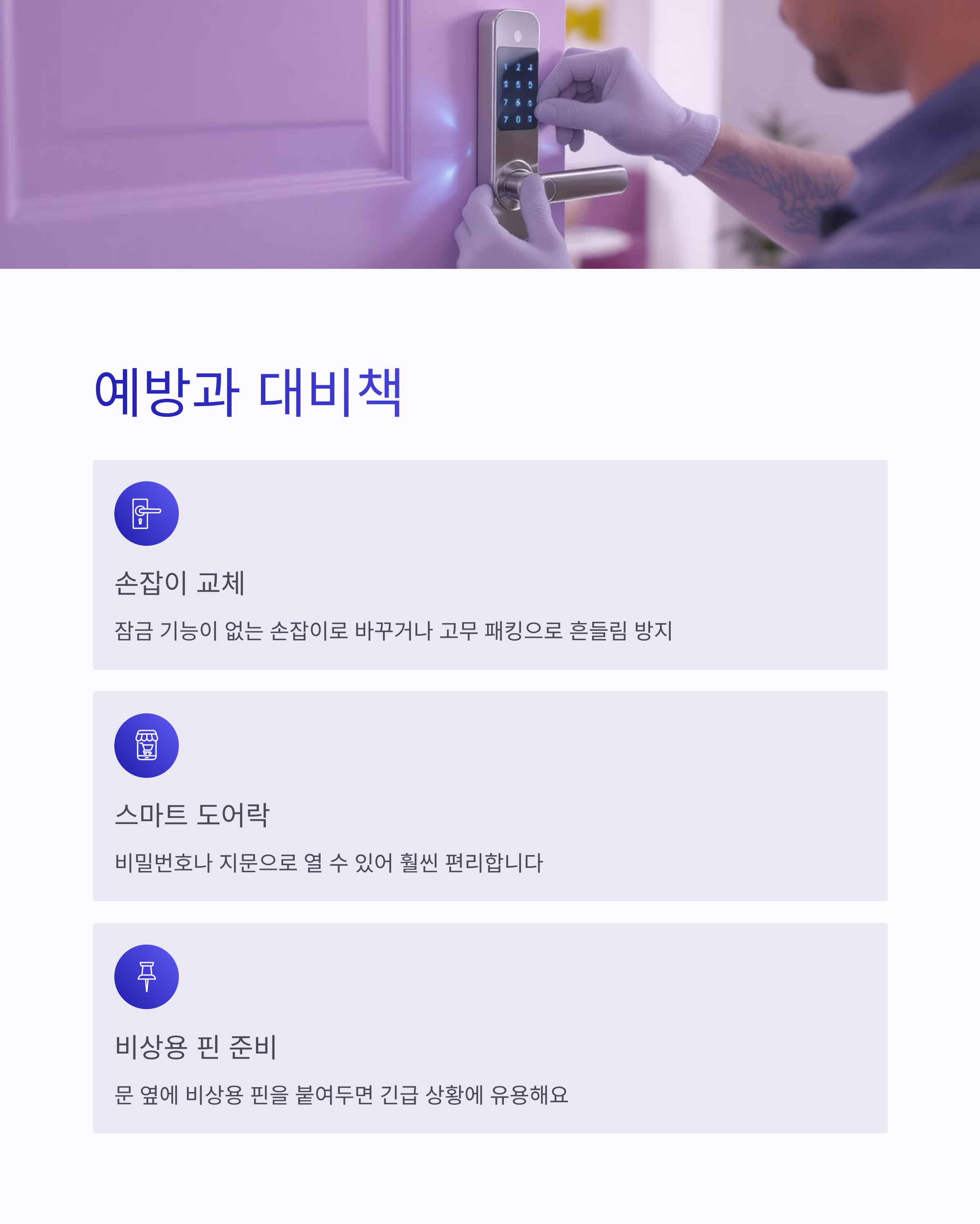 누구나 한 번쯤은 겪을 수 있는 방문 잠김 사고, 당황하지 않고 침착하게 대처하는 게 제일 중요해요.