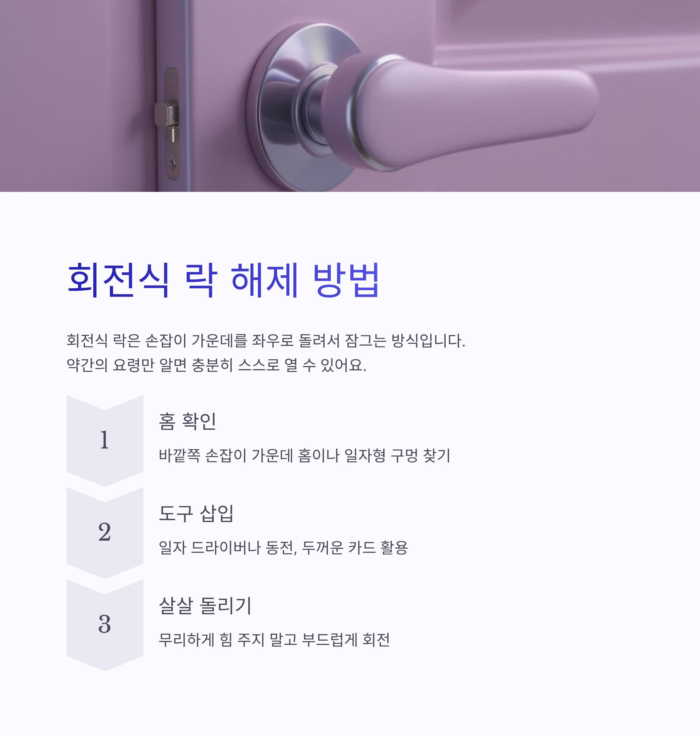| 회전락 (Twist) | 홈에 드라이버 또는 카드 끼워 돌리기 | 일자 드라이버, 플라스틱 카드 |