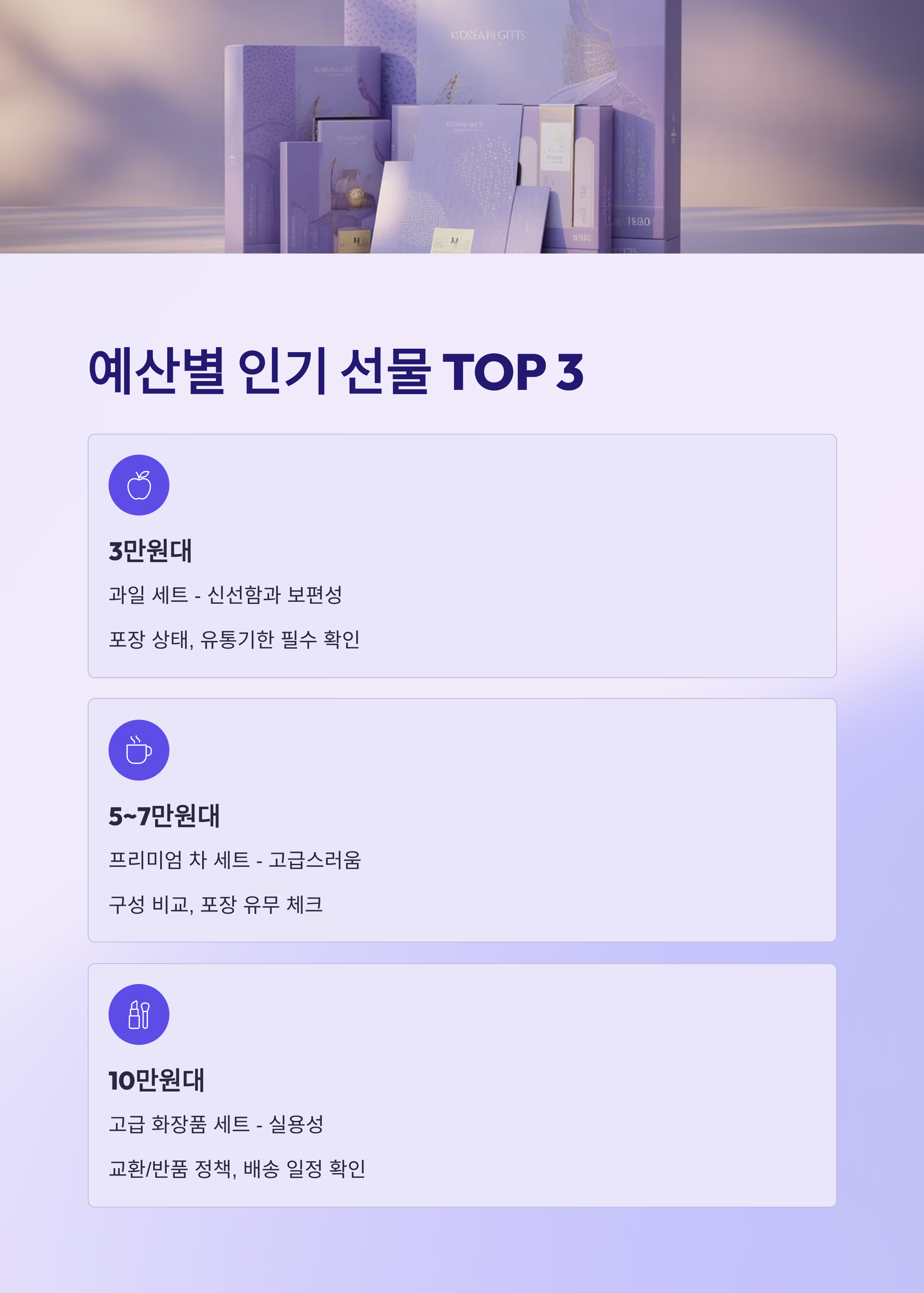 선물 선택의 가장 큰 기준은 역시 예산이죠. 아래는 가격대별로 가장 인기가 많은 추석 선물 아이템을 정리한 표입니다.
