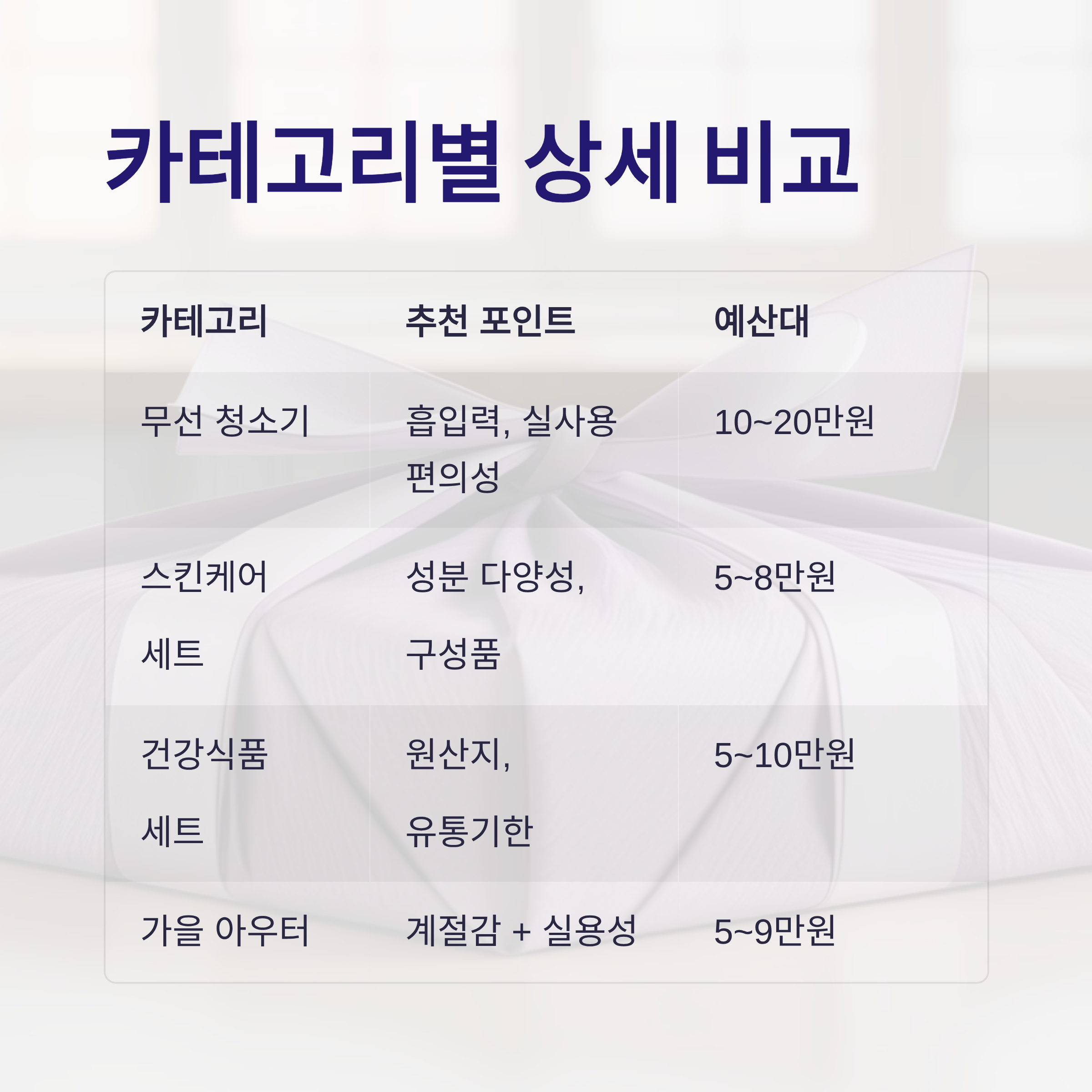 | 무선 청소기 | 흡입력, 실사용 편의성 | 무게, 배터리 확인 | 10~20만 원대 |