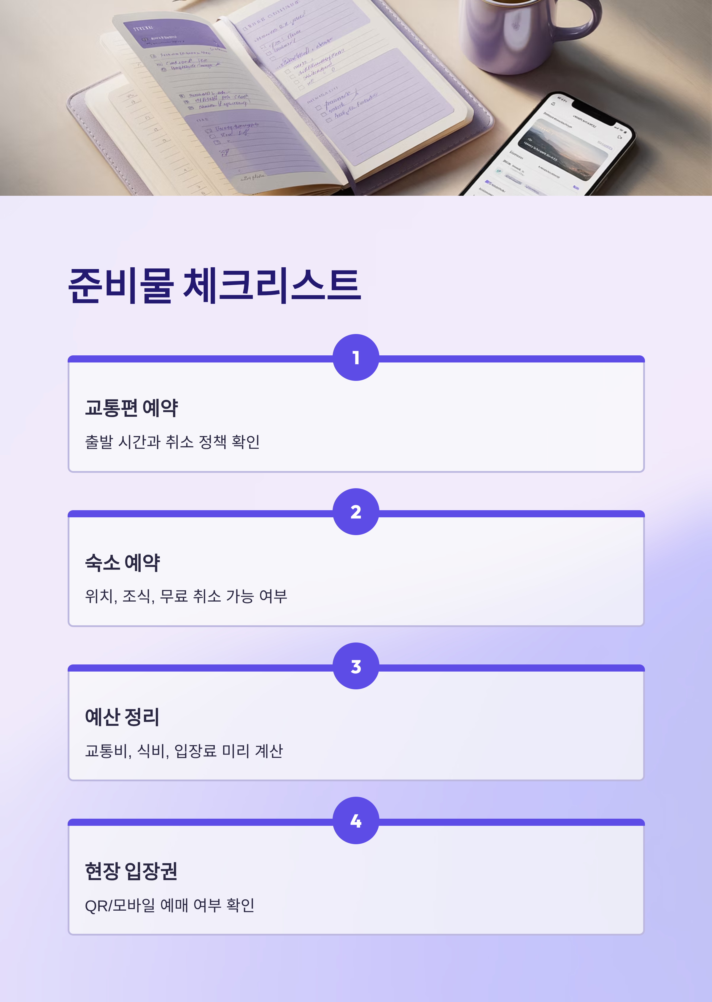 | 예산 정리 | 교통비, 식비, 입장료 미리 계산 |