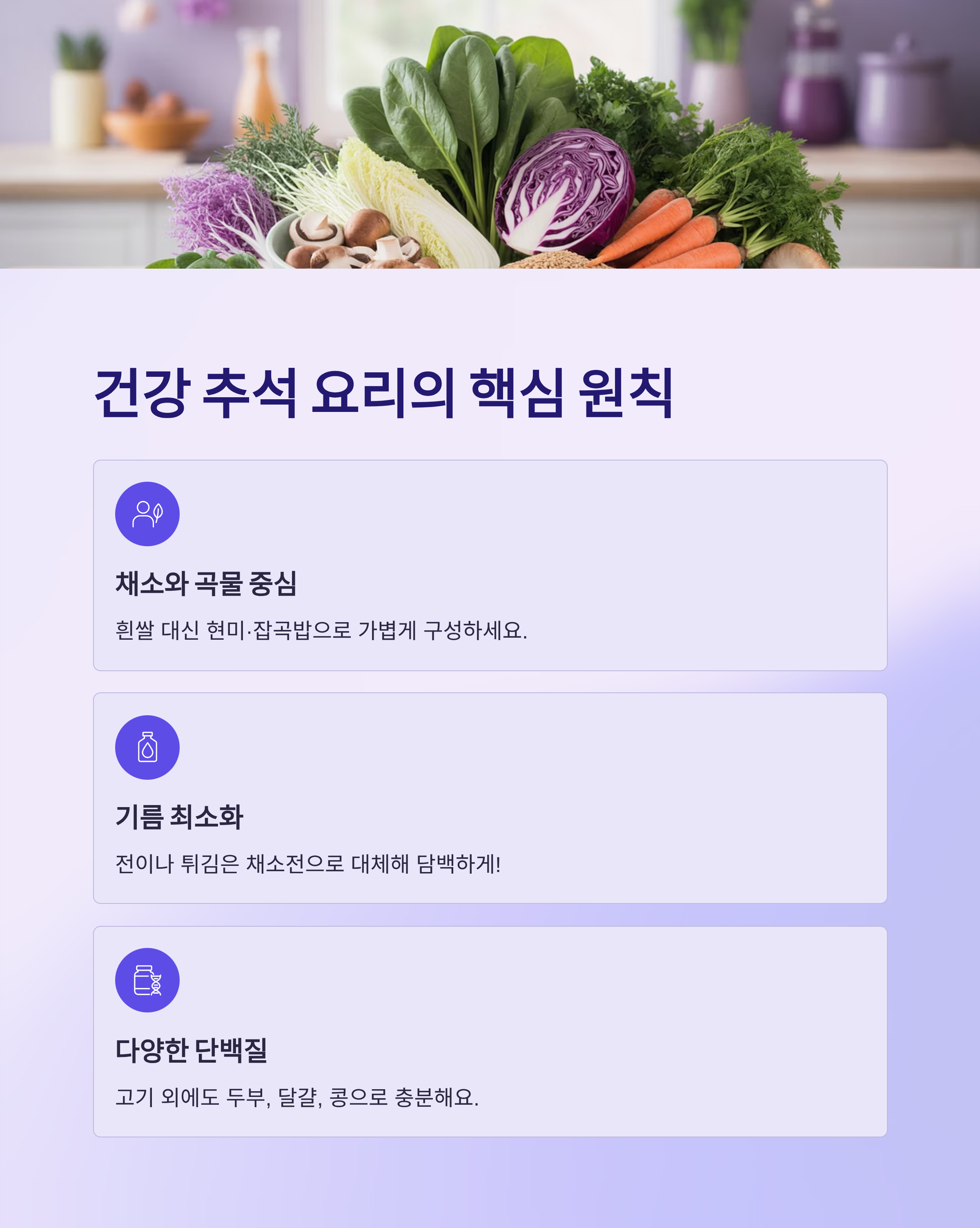 예를 들어 흰쌀밥 대신 현미나 잡곡밥, 전이나 튀김은 기름을 최소화한 채소전으로 대체할 수 있어요.