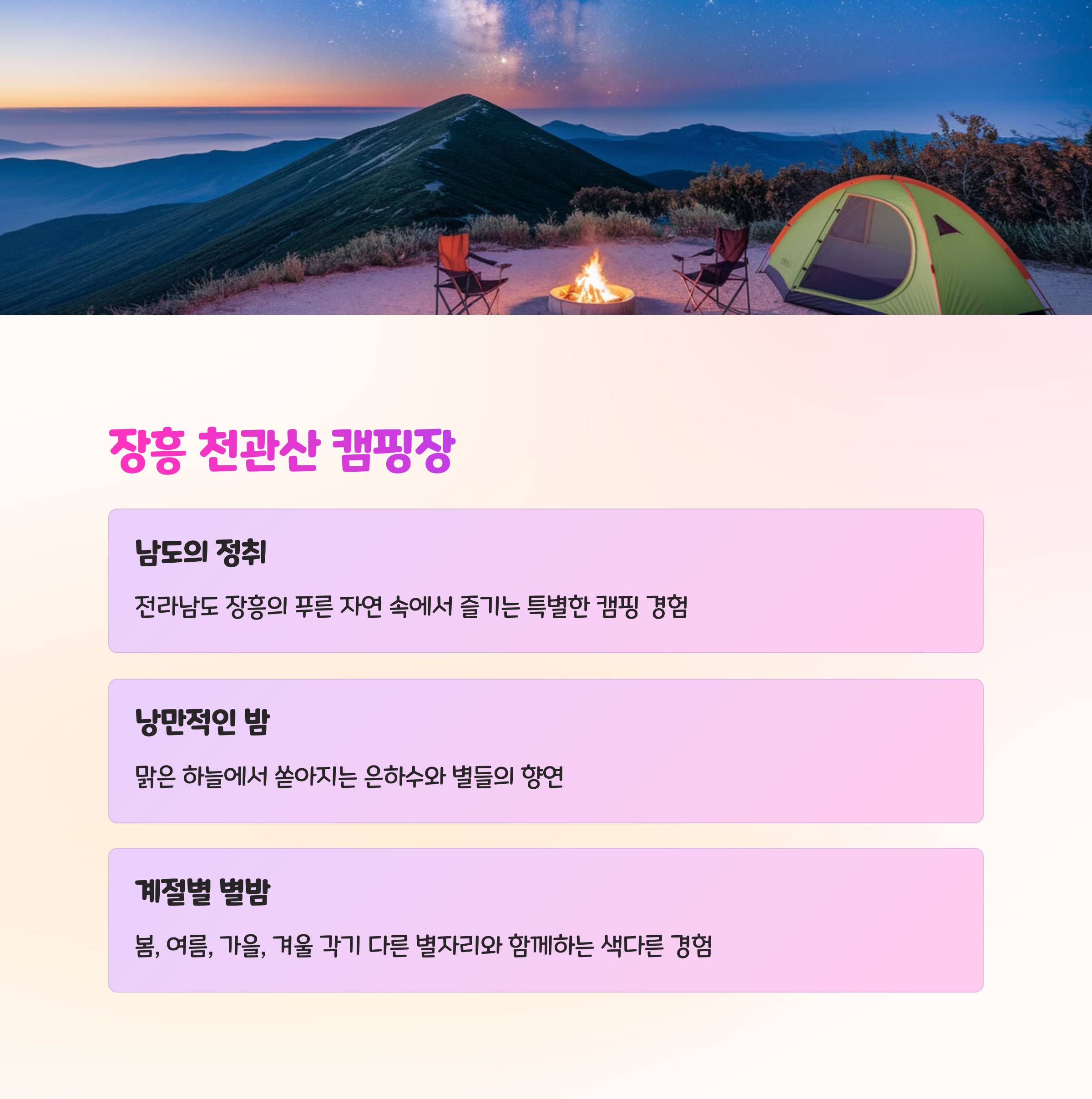 6. 전남 장흥 '천관산휴양림 캠핑장' – 별도 보고 새도 보고🦉✨