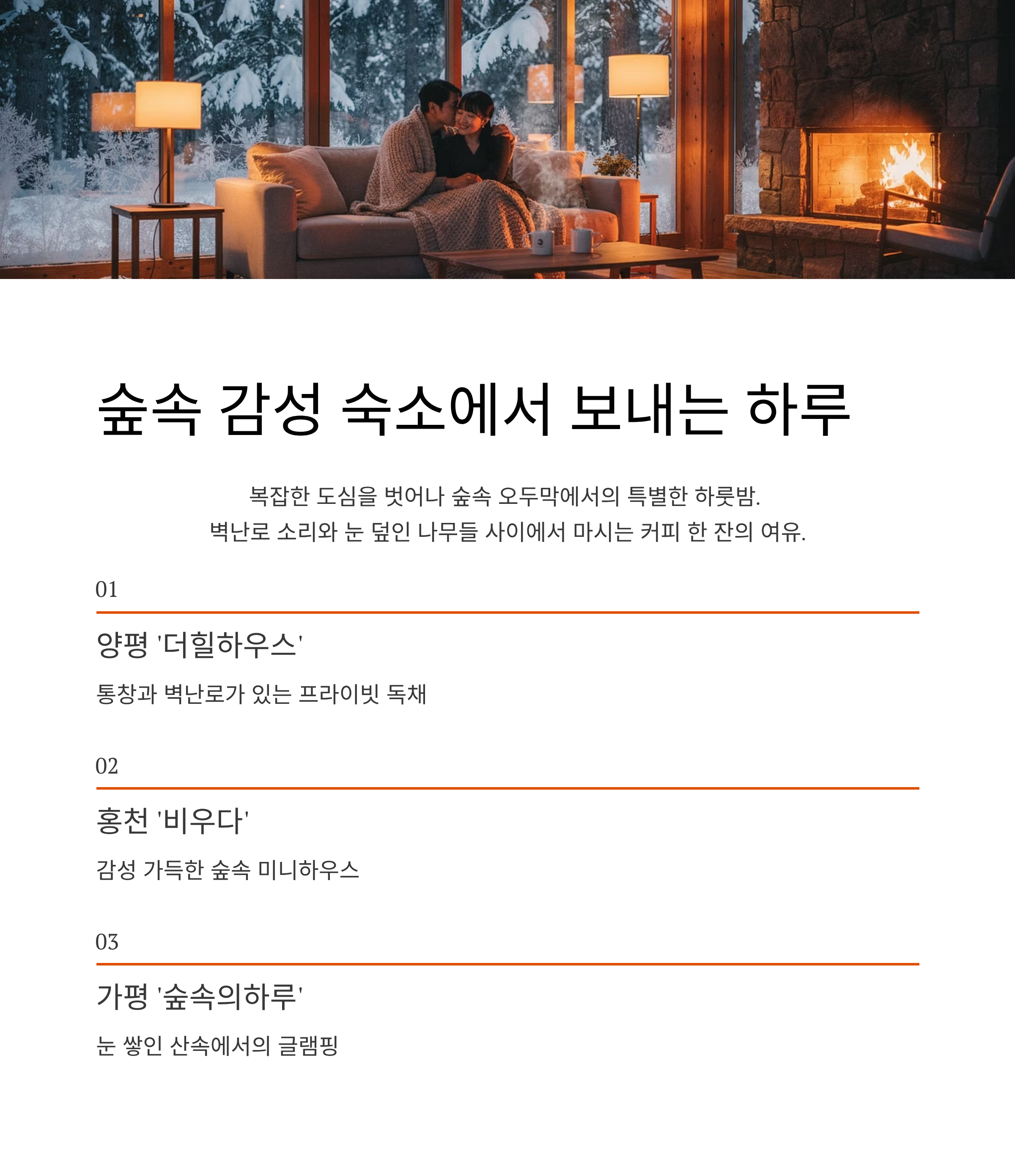 겨울엔 그런 상상이 현실이 될 수 있어요. 양평이나 홍천 같은 지역에는 숲과 가까운 독채 숙소들이 많아요.