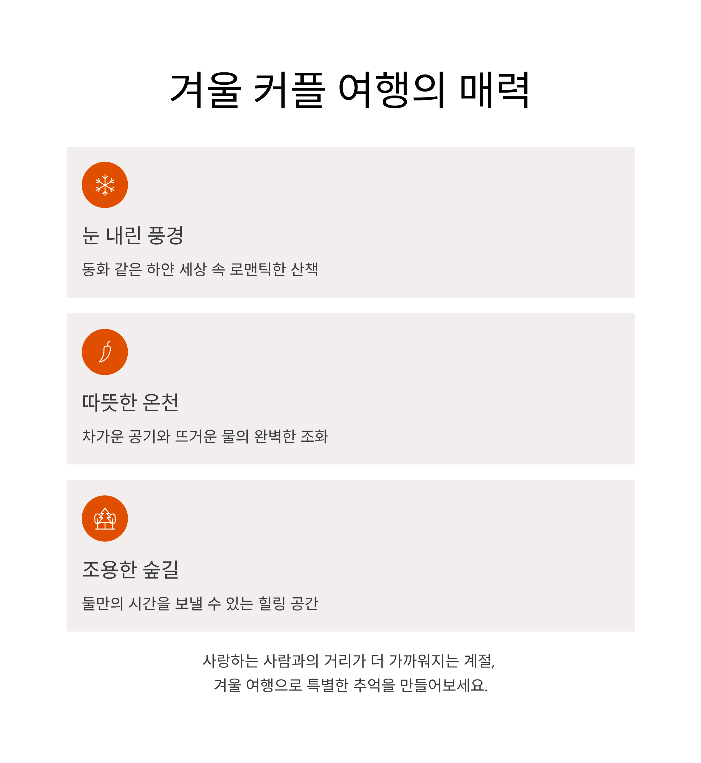 누구나 한 번쯤은 꿈꾸는 장면이죠. 커플 겨울 여행은 단순한 나들이가 아니라,