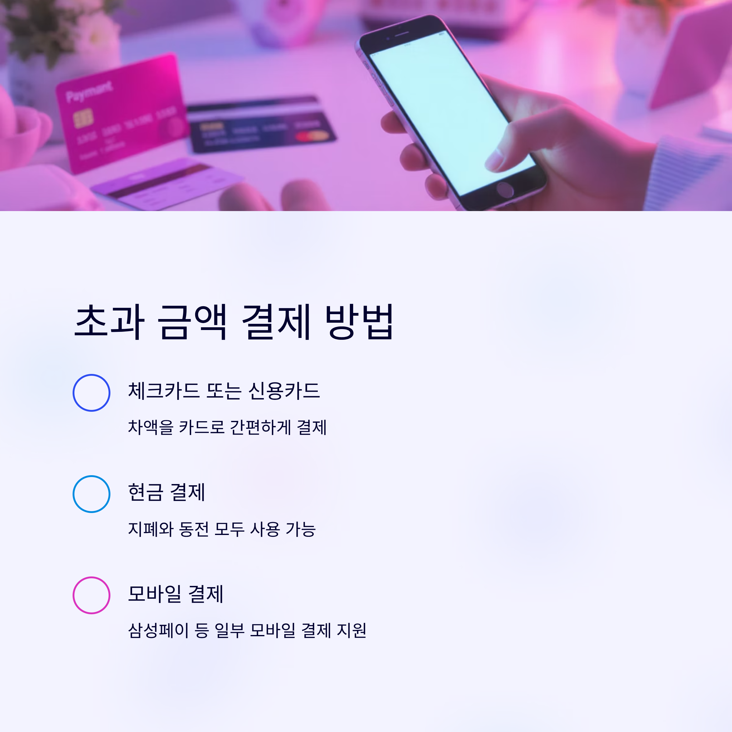초과 결제 시 가장 흔하게 고민하는 게 '카드 vs 현금'인데요, 둘 다 장단점이 있어요. 아래 표에서 깔끔하게 비교해드릴게요.