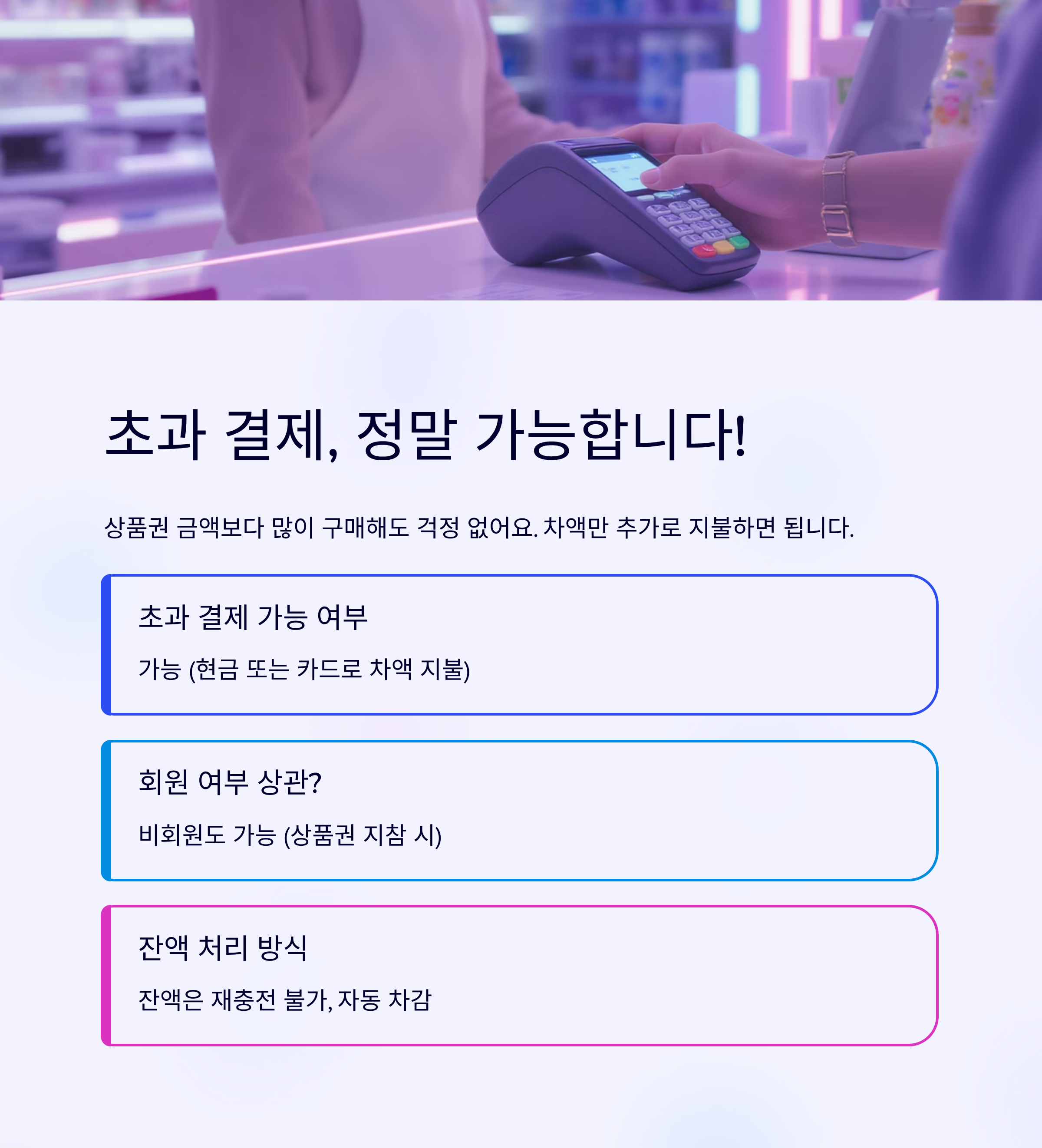 | 잔액 처리 방식 | 잔액은 상품권으로 재충전 불가, 자동 차감 |