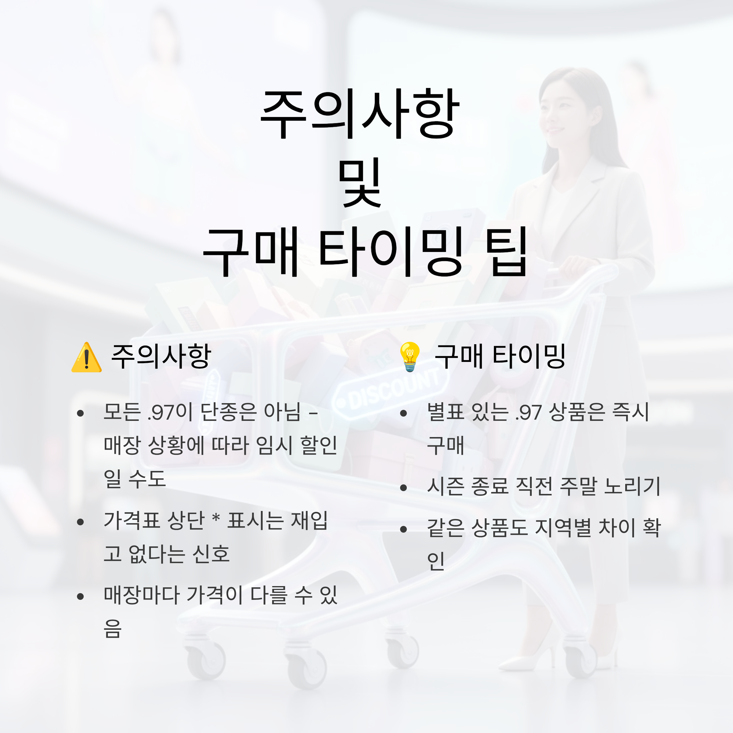출입구 주변, 시즌성 행사 코너, 베이커리·생활용품 쪽에서 유독 .97과 .00 가격이 많아요.