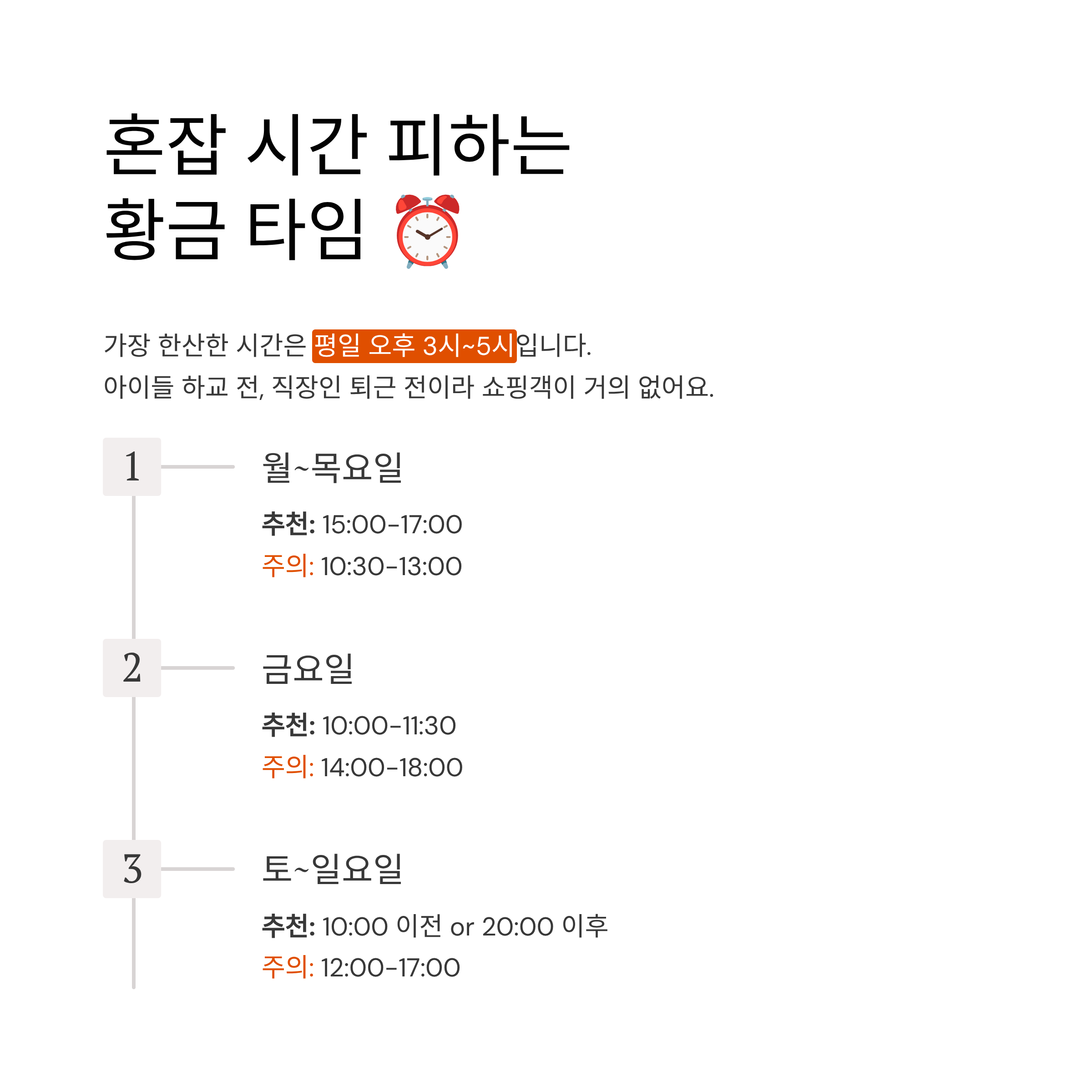 실제로 저는 이 시간대에 가면 널널한 주차 공간에 여유롭게 쇼핑할 수 있어서 너무 좋더라구요.