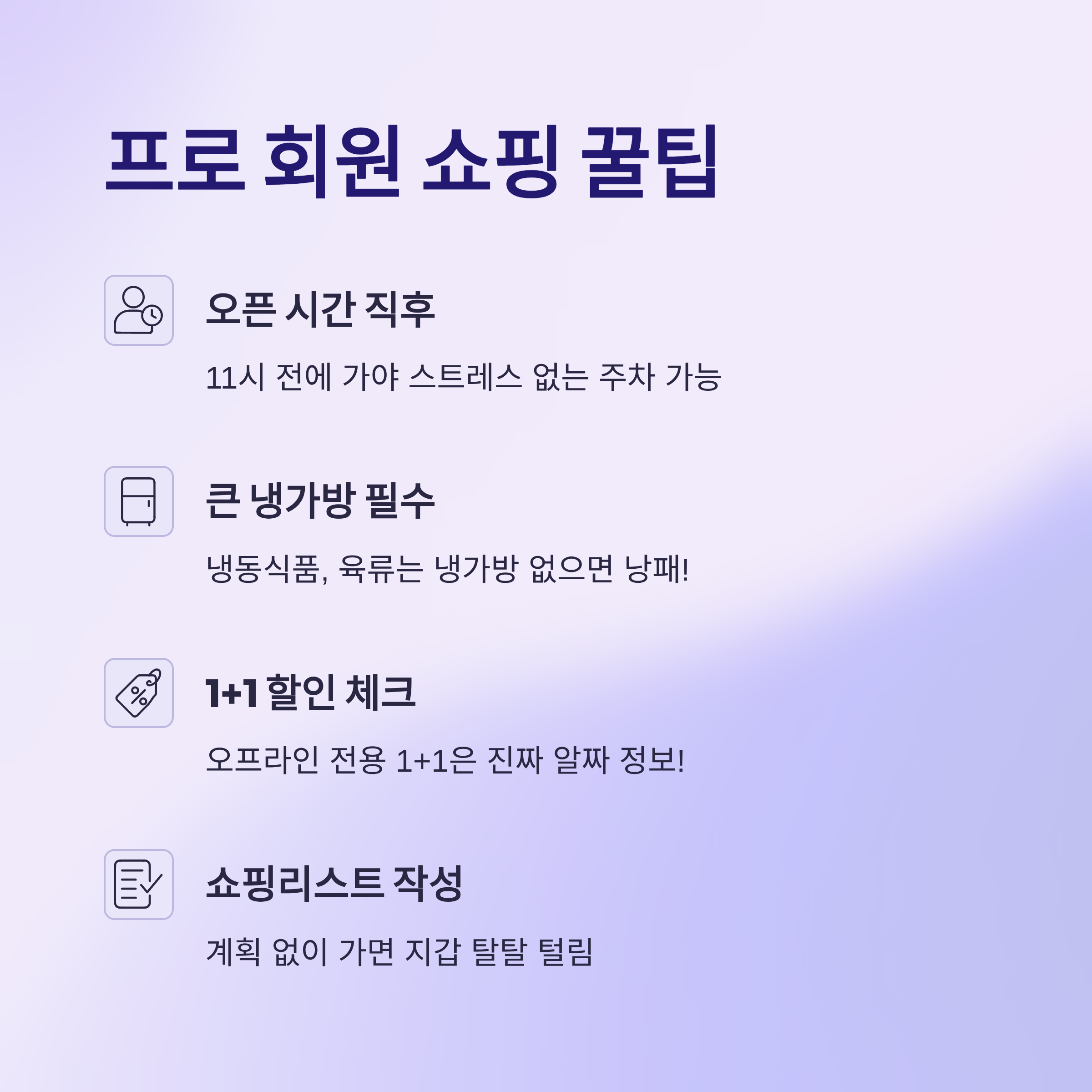 | 쇼핑리스트 작성 | 계획 없이 가면 지갑 탈탈 털림 |