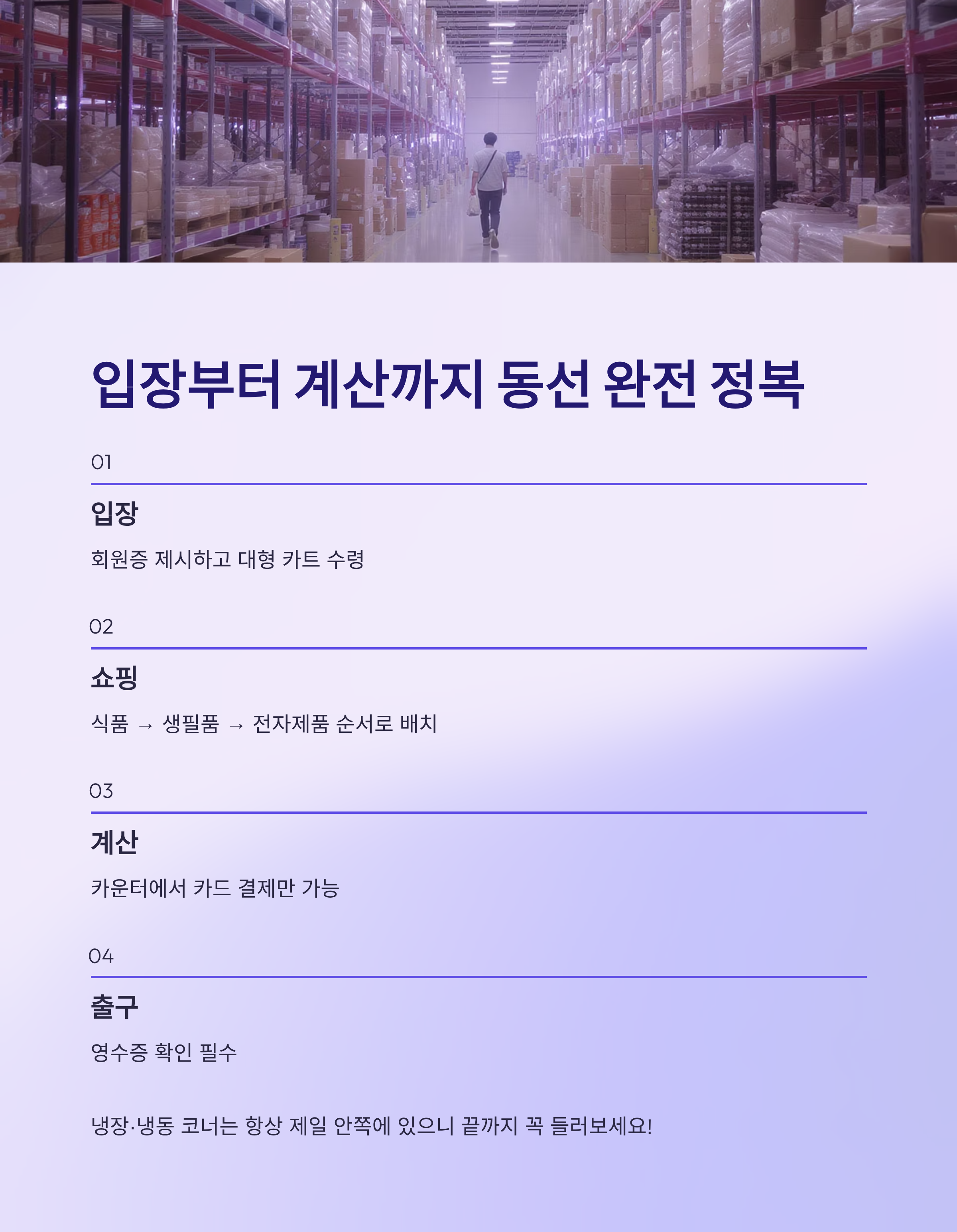 대형 카트를 끌고 복잡한 매장을 돌다 보면 꼭 필요한 걸 놓치기 쉬우니, 동선을 미리 파악해 두는 게 좋아요.