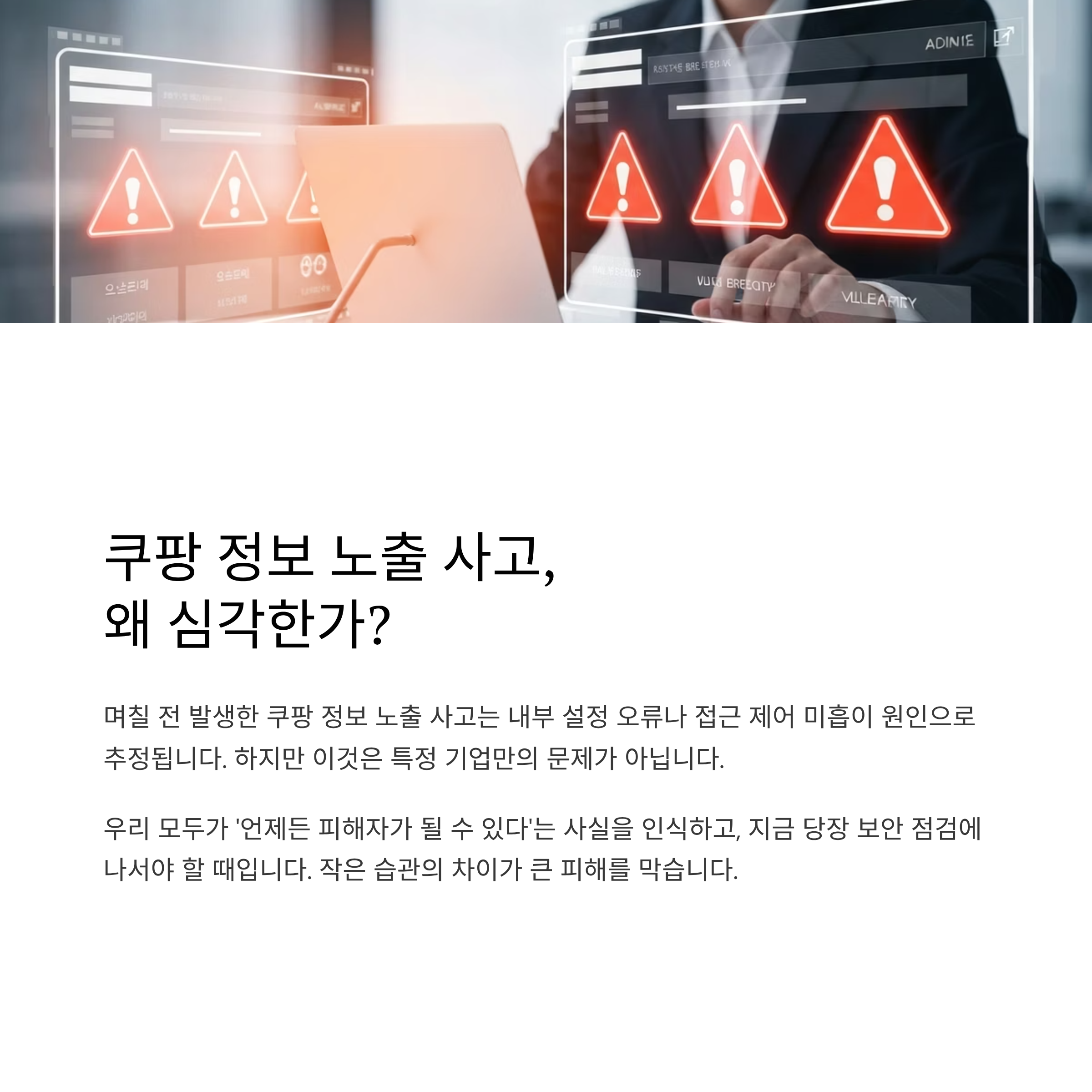 쿠팡 정보 노출 사고는 우리 모두에게 ‘보안은 남의 일이 아니다’라는 경고를 줬어요.