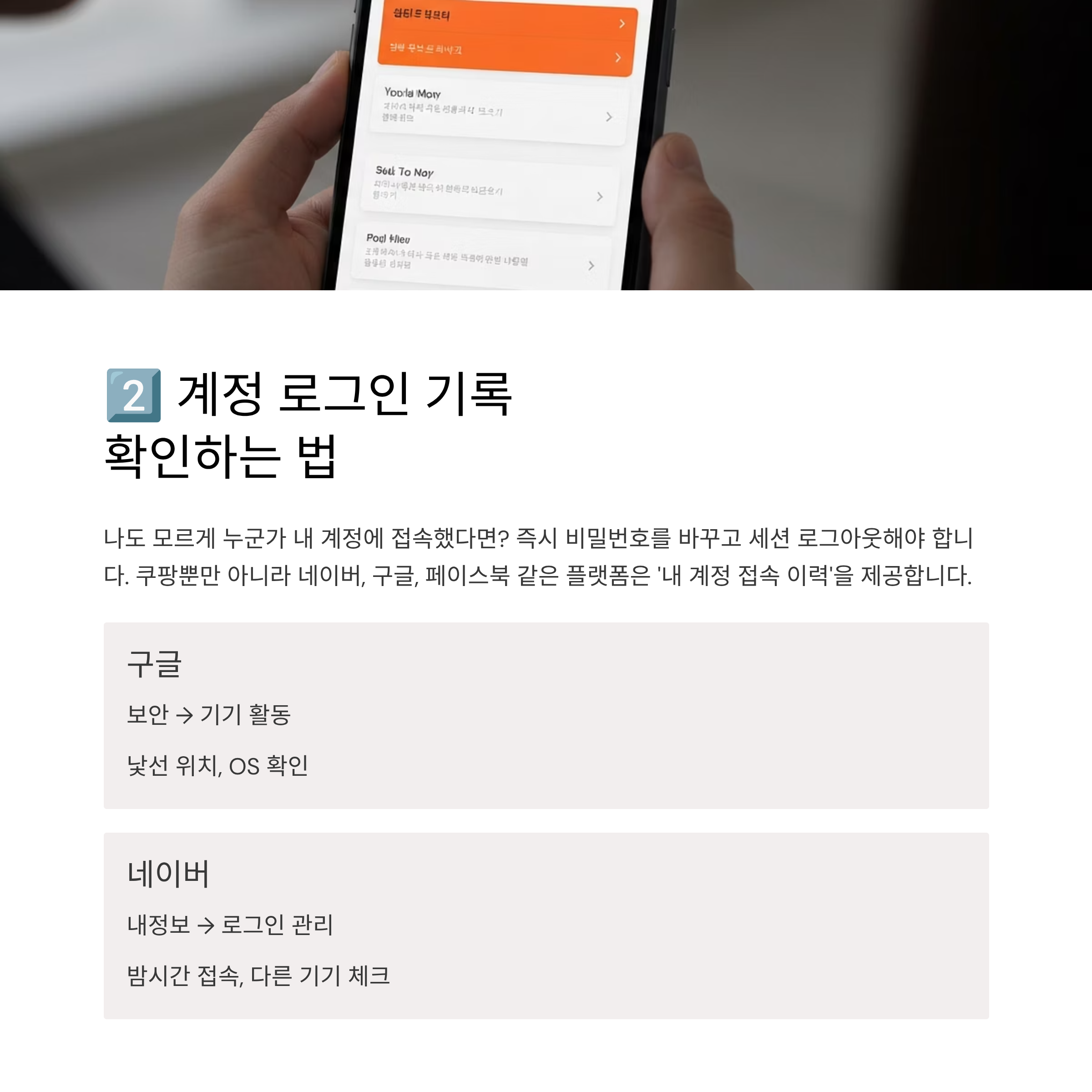 쿠팡뿐만 아니라 네이버, 구글, 페이스북 같은 플랫폼은 ‘내 계정 접속 이력’을 제공해요.