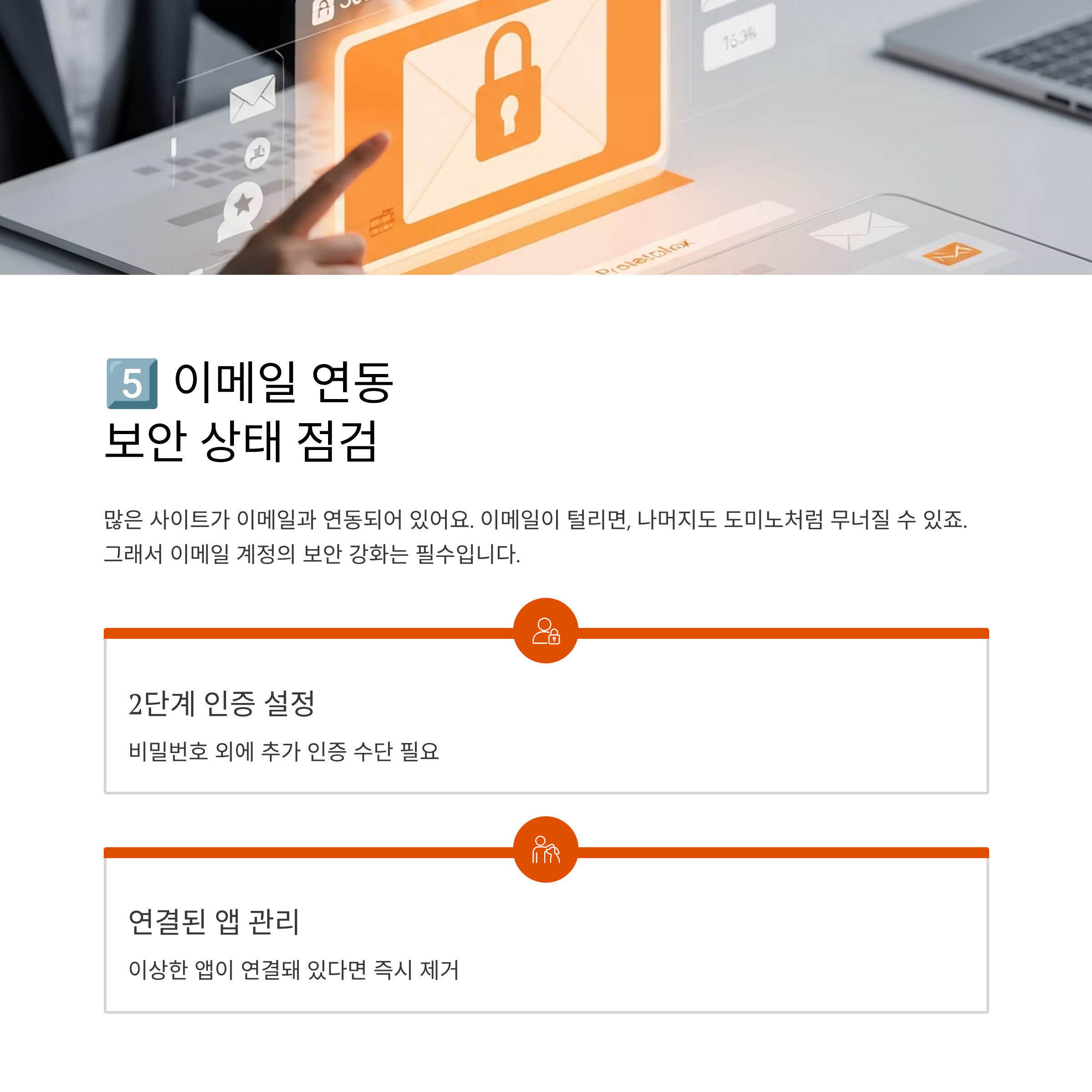 많은 사이트가 이메일과 연동되어 있어요. 이메일이 털리면, 나머지도 도미노처럼 무너질 수 있죠.